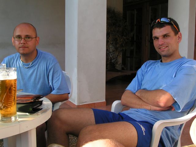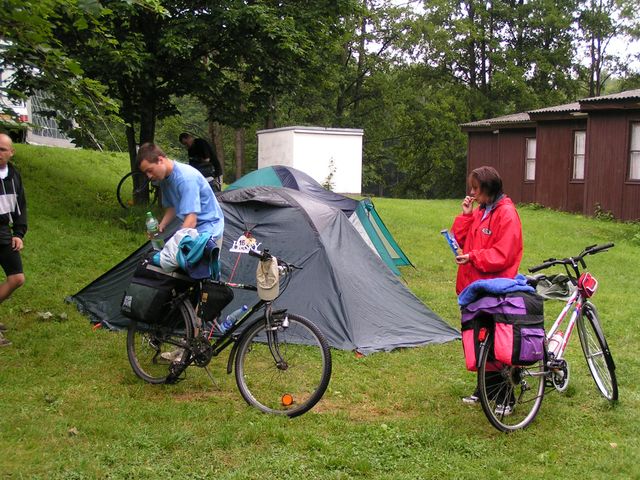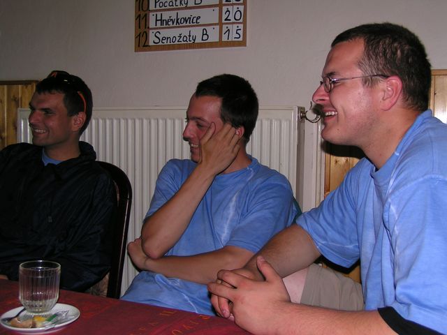 Večer se kocháme padající mlhou a romantický pohled ruší jen běhající pošuk (z kopce - do kopce - snad stokrát!). Dnešní etapa končí skoro za tmy v chatové oblasti u Žirovnice. Milan má krizi, která trvá až do středy (možná za to můžou spálená ramena). Na terase má stará bréca z kiosku zálusk na Tomáše a Martina, rozdává hubičky a jako náhradu nabízí své nezletilé dcery. Spíme u rybníka, kde je zima jako blázen. Milan spal z kopce zaražený o strom.