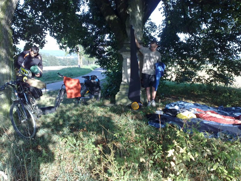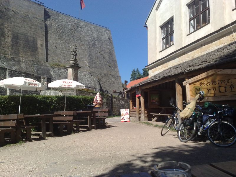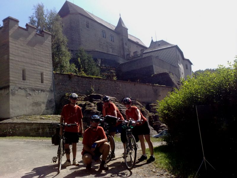 Snídačka v místní "Jednotě" a vyrážíme směr hrad Kost. V podhradí dáváme jedno na prudko, Martin, Milan a Pavča kupují vstupenky na prohlídku, Petr hlídá kola v restaurační zahrádce. Prohlídka je zpestřena sokolnickým vystoupením. Sice hned první dravec neposlušně letí na protější kopec a nevrací se, ale jinak to bylo pěkný. Po prohlídce „už ho začínáme mít“. Petr navrhuje pension ve Žďáru, kde trávili v červenci dovolenou. Chce totiž pozdravit kuchařku Bětku.