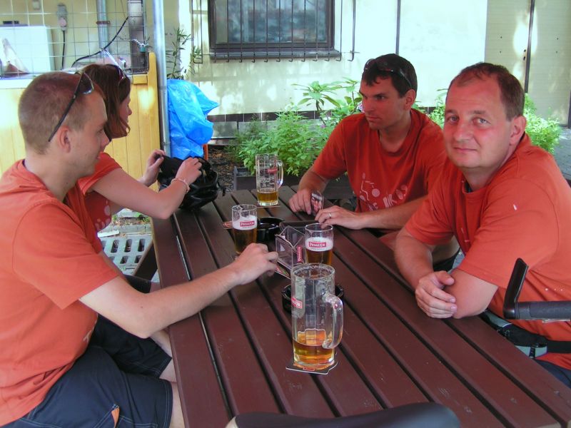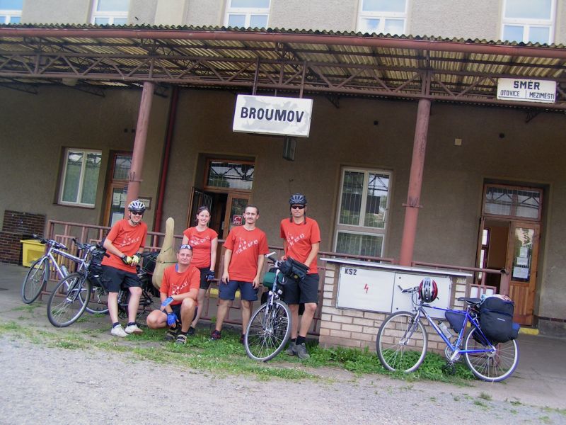 Z Prahy pokračujeme do Starkoče, kde na nás měl čekat přípoj do Broumova. Leč dráhy opět nezklamaly a přípoj na náš zpožděný vlak nečekal. Přejíždíme tedy na kole do Náchoda, kde obědváme a jsme mile překvapeni cenami v jídelníčku. Jak jsme si později všimli, ceny byly příjemné v celém Broumovském výběžku. Z Náchoda pokračujeme opět vlakem až do Broumova. Odteď jsme odkázáni jen na naše bicykly.