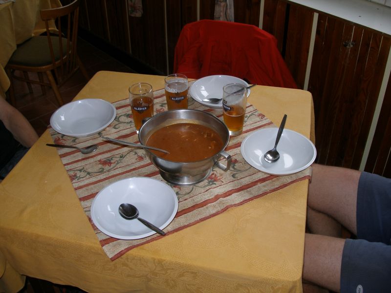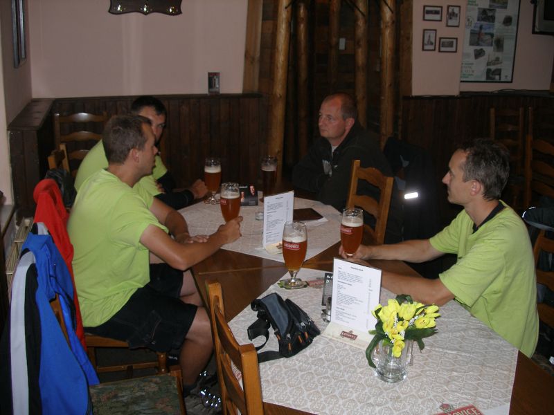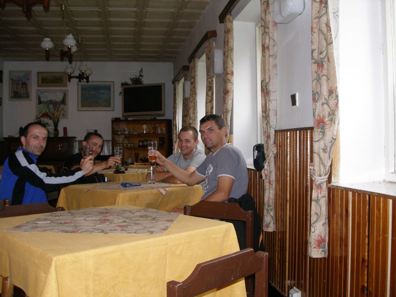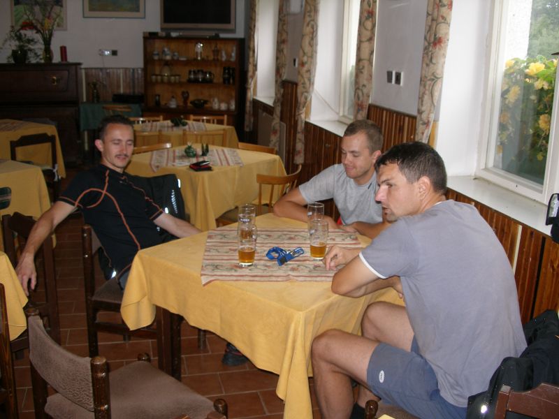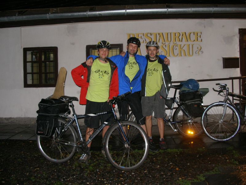 Probouzíme se v pionýrské chatce Penzionu ve vesničce Skalka u Doks. Martin hrdinně zvládl noc na palandě bez postranní zábrany a k překvapení všech ani jednou za noc nespadl. Počasí je nádherné: stejně jako celý předchozí den hustě prší. Nezbývá nám nic jiného, než si v poklidu zajít na snídani a rozjímat co uděláme dál. Už i Tomášovi začíná být jasné, že sobota je pro letošní ročník Tůr de Bír konečnou. Samozřejmě to na sobě nedává znát a hecuje ostatní k dalšímu cestování. Neúspěšně... Zpáteční vlak z Doks nám odjíždí kolem půl druhé. Máme tedy dostatek času dát si kvasnicový Klášter, který nám minulý večer docela přirostl k srdci. Ještě si dáváme obědovou dršťkovou, loučíme se s majitelem a řádně zabaleni do pláštěnek se za neustávajícího hustého deště vydáváme na kole směr nádraží Doksy. I těch zhruba 20 minut stačí k tomu, abychom byli řádně promočení. Přijíždíme na nádraží, které okupuje asi 100 lidí nejen bílé barvy pleti. Jak je vidět mizerné počasí neodradilo z víkendového pobytu na Máchově jezeře jenom nás.