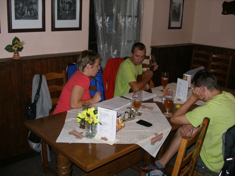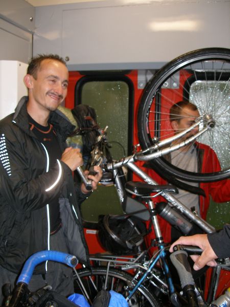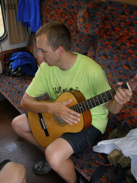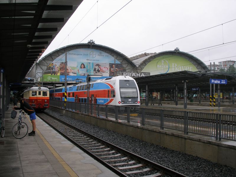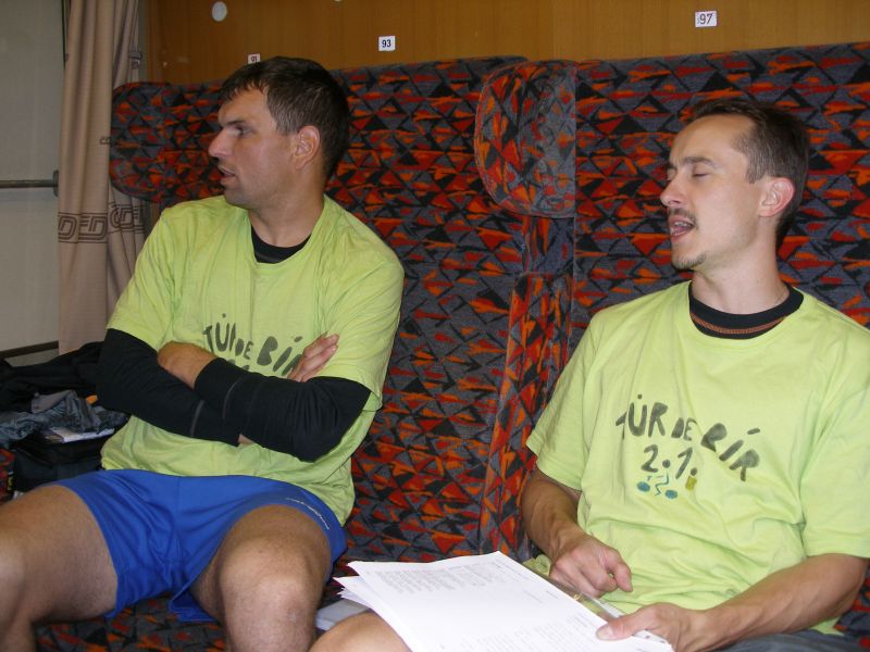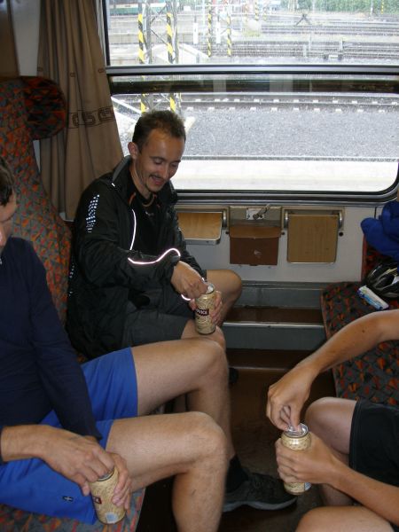 Někteří vyrazili skutečně nalehko. Zase takové horko, aby šel člověk v sandálech není :-). Všude je zmatek, mraky lidí a vůbec není jisté, jestli se všichni vejdeme do vlaku. Situace se nakonec vyřešila sama. Romská asi tak 30ti členná rodina odjíždí vlakem na opačnou stranu než my. Snad by to mohlo klapnout... A skutečně, do vlaku jsme se úspěšně dostali a pádíme směr Praha. A nejsme sami. Takových zmoklých slepic jako jsme my je ve vlaku podstatně víc :-). Tomáš se kochá elektronickou vyspělostí vlakového WC. Je tam totiž všechno na elektronická tlačítka, otevírání a zavírání dveří, splachování, ale i pouštění vody do umyvadla:-). Cesta do Prahy proběhla bez problémů. V Praze nakupujeme Krušovice v plechu a po asi hodninovém čekání vyrážíme směr Příbram.