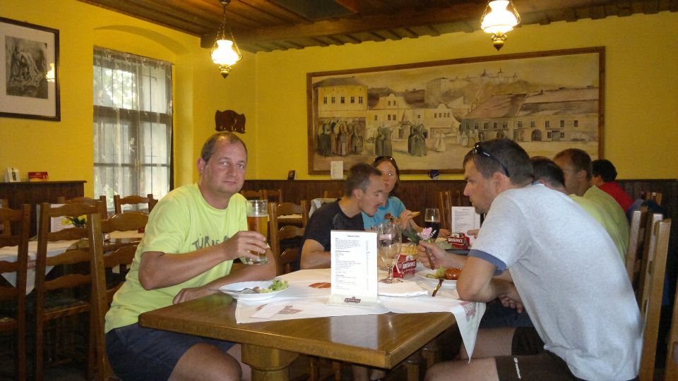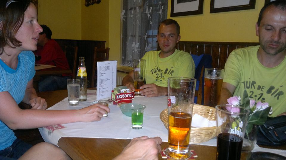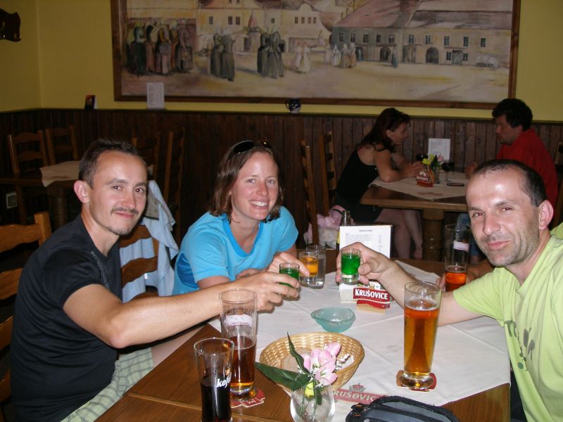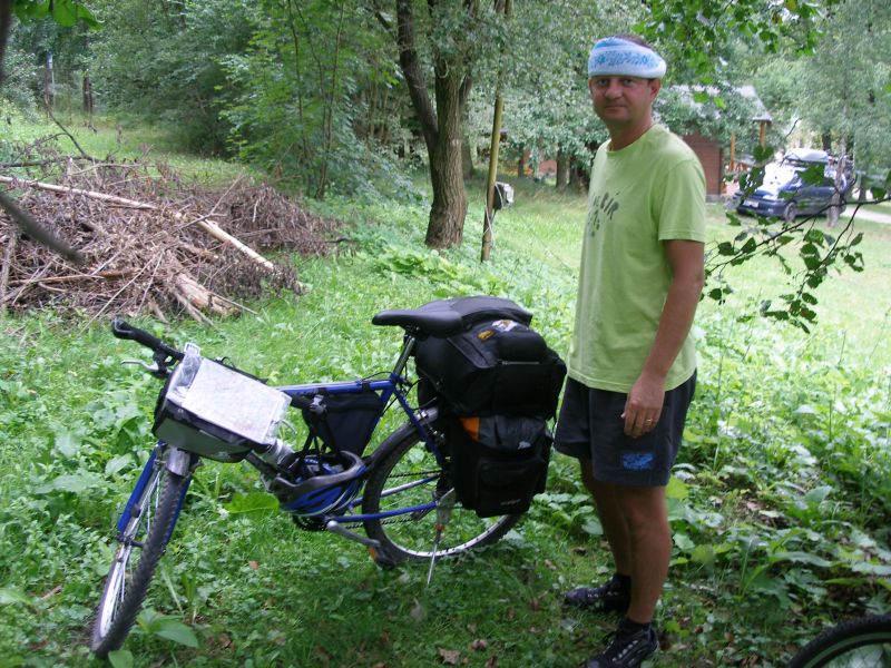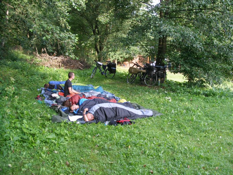 Probouzíme se pod širákem u plotu v kempu u Luhačovické vypuštěné přehrady. Někteří se trochu diví, jak se dostali do svých spacáků, a Petr s mokrým ručníkem na hlavě snídá brufen. Ponožky s pivem, nedílnou součást letošního dresu, si dnes už netroufne vzít nikdo. Je jasný, že moc daleko už na kole nepojedem, takže nechvátáme, v pohodičce zabalíme a jdem na snídani do bufetu v kempu. Místní servírka nás vítá s otevřenou náručí, jak jinak, když s námi strávila tak pěkný večer… Dáváme si polívčičky, vajíčka, trochu se vzpamatováváme, srdečně se rozloučíme s nelepším kámošem Adama Malysze a vyrážíme se na posledních pár kilometrů na kole.