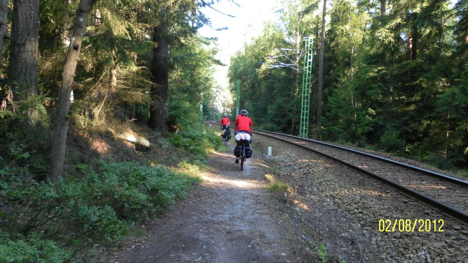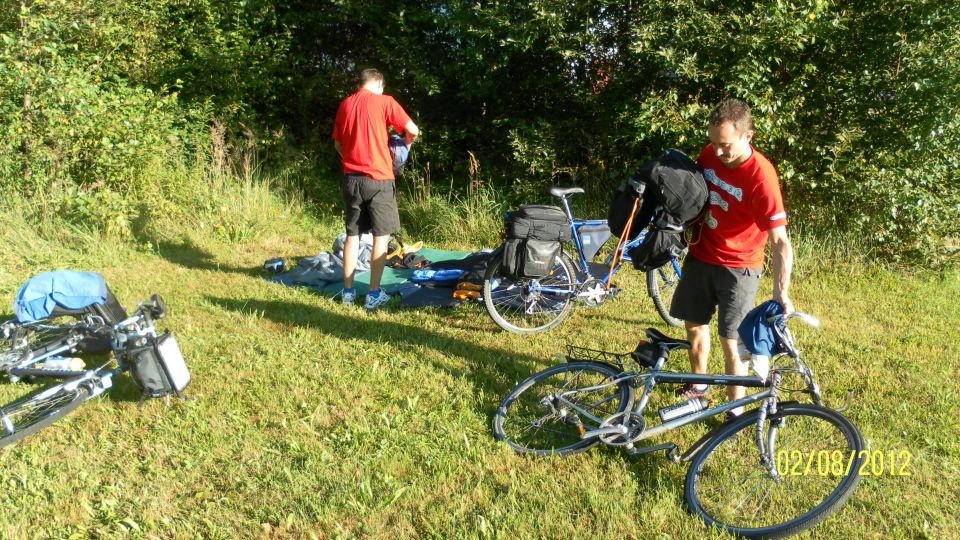 Milan odolává pokusům slečny od vedlejšího stolu o zahájení kytarové produkce. Už jsme pěkně veselí a stmívá se, a není to tmavými brýlemi. Sedáme po chvíli na kola a jedeme zdolat poslední kus dnešní cesty do cílové stanice Bezdrev. Cesta je po cyklostezkách a pořád po rovině. Jen ty slečny po dešti nějak nejezdí ...