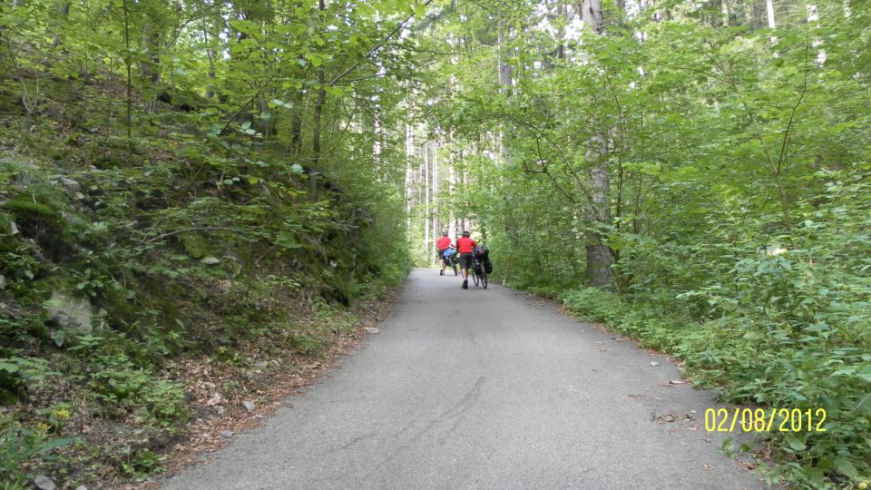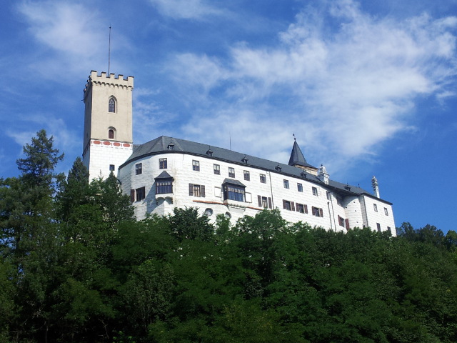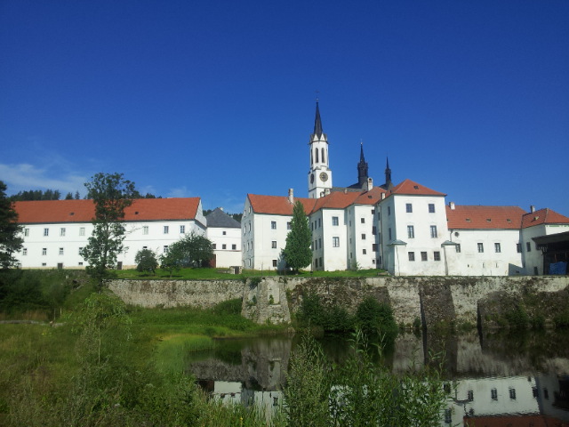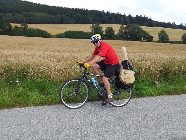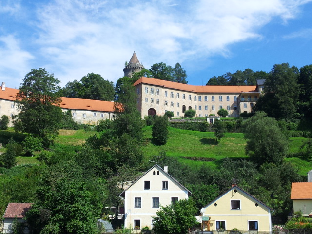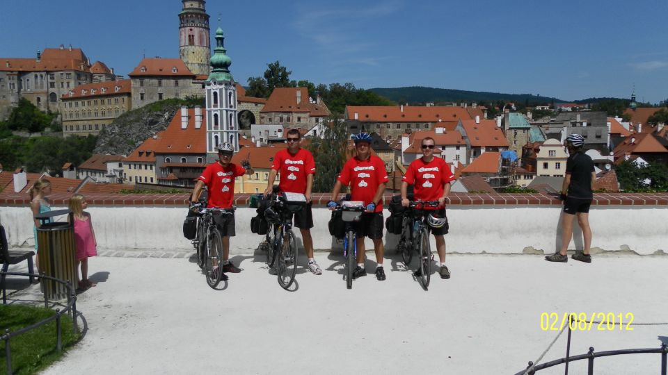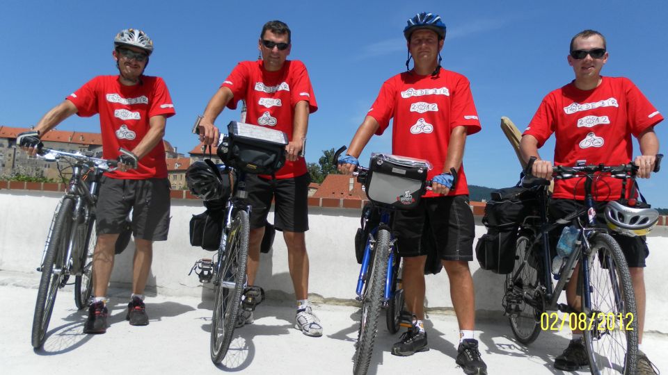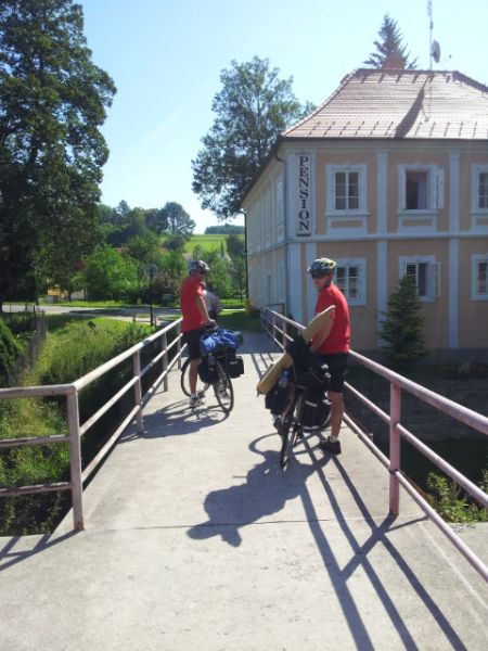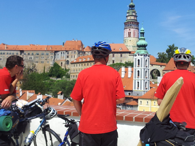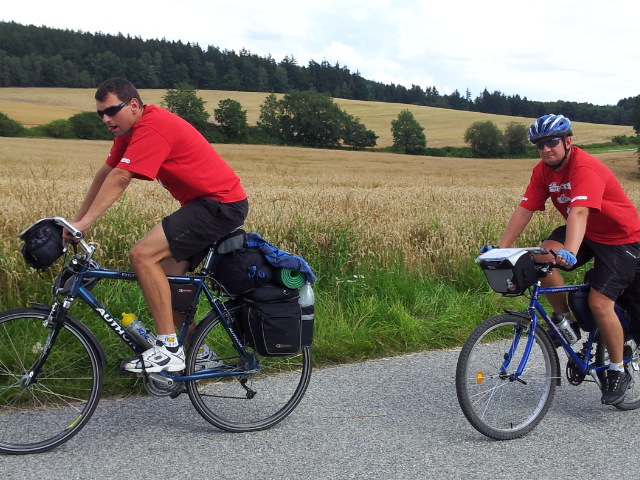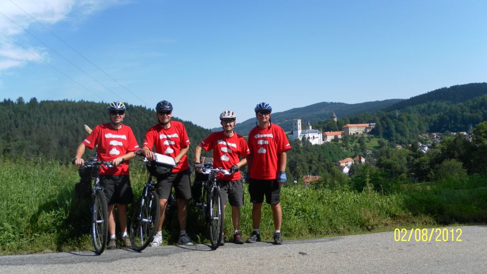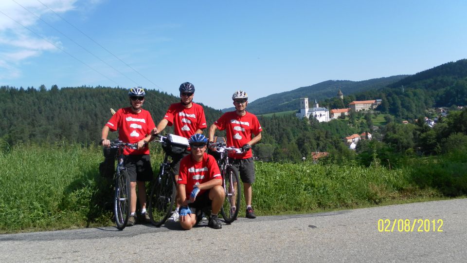 Hned jak sbalíme spacáky a osedláme kola, vyrážíme podél vody a železniční trati do Vyššího Brodu. Tam se snad najdou lepší panoramata. Ve Vyšším Brodu snídáme na náměstí a domlouváme se kudy dál. Řádně posilněni jak snídaní, tak ranní zelňačkou se vydáváme směr Rožmberk nad Vltavou. Záhy zjišťujeme, že Vyšší Brod není zas tak vysoko jak by se dalo podle názvu očekávat. No prostě je to hned od začátku pěkně do kopce ... (cyklostezka č: 1188 Vltavská). Ale ty výhledy, no prostě paráda. Nad Rožmberkem děláme „groupen foto“. Počasí je nádherné: slunečno a mírný větřík. Žádný defekty, žádná zranění, všechno běží až podezřele hladce.