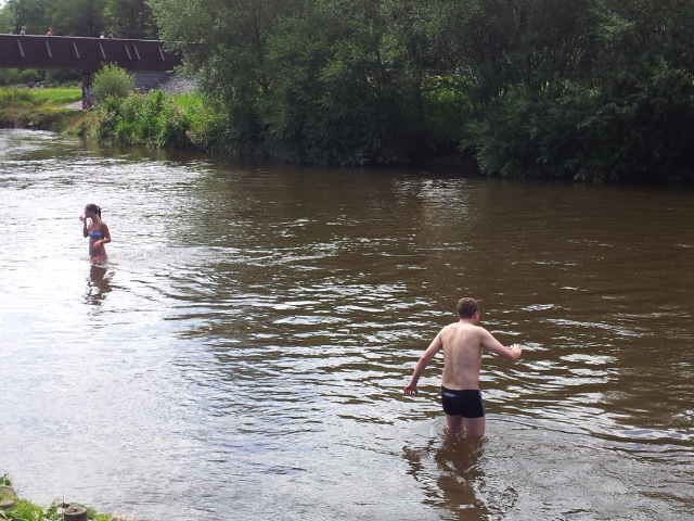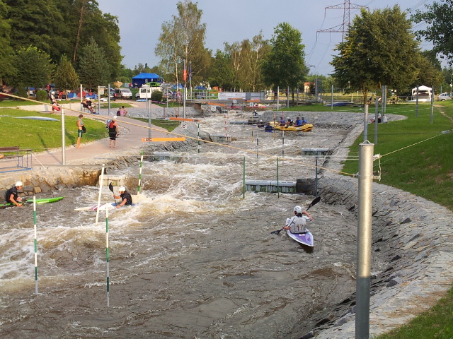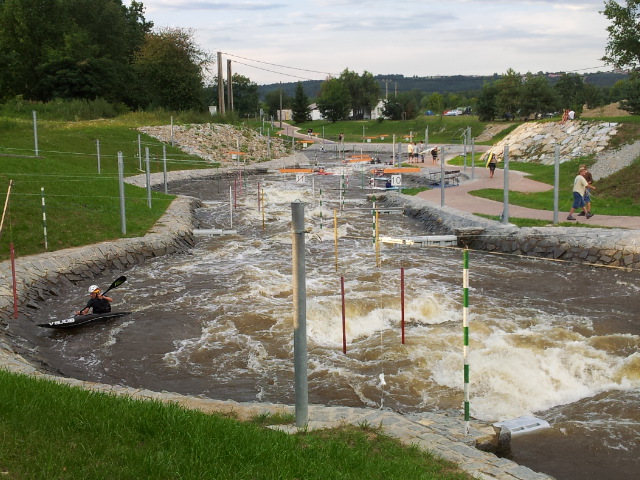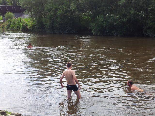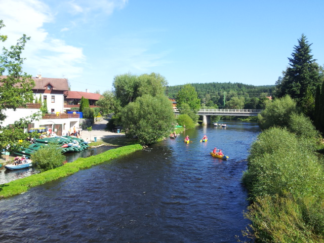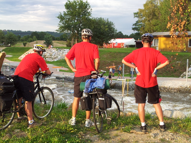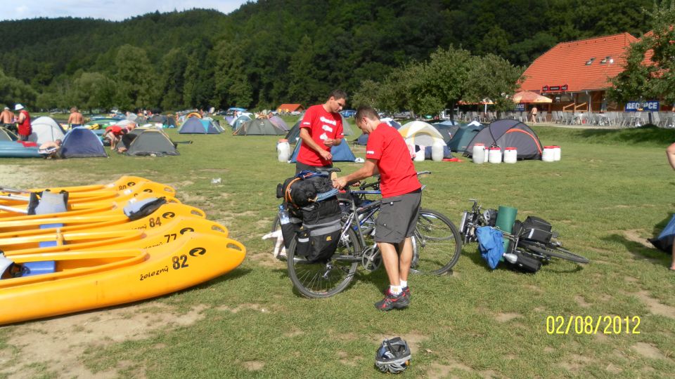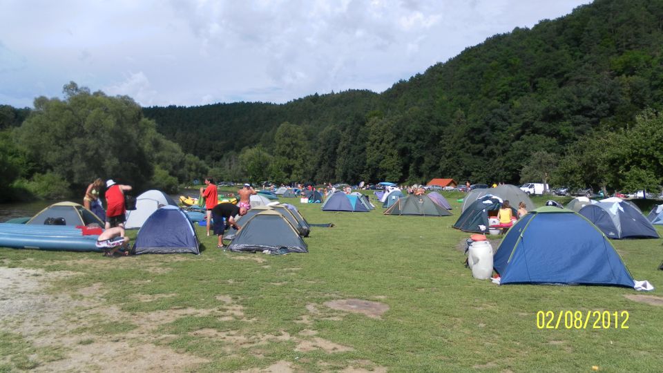 Razíme dál do Zlaté Koruny. Ve vodáckém kempu si prozměnu dáváme dva kousky a oplachujeme upocená těla ve Vltavě. I proti proudu je třeba se dost snažit, aby to člověka nestrhlo. Za chvíli připlouvají jedna po druhé skupiny lodí a nejen to, i krmení pro rybičky od jedné z vodaček :-). Během hodiny je kemp slušně zaplněný vodáky a jejich stany. Raději to balíme a jedeme dál přes Kamenný Újezd, Boršov nad Vltavou a Planou do Českých Budějovic.