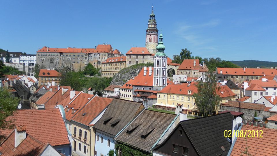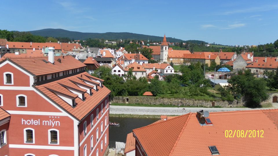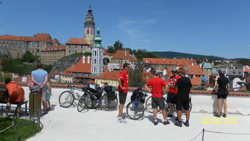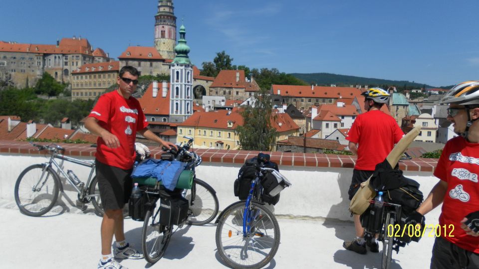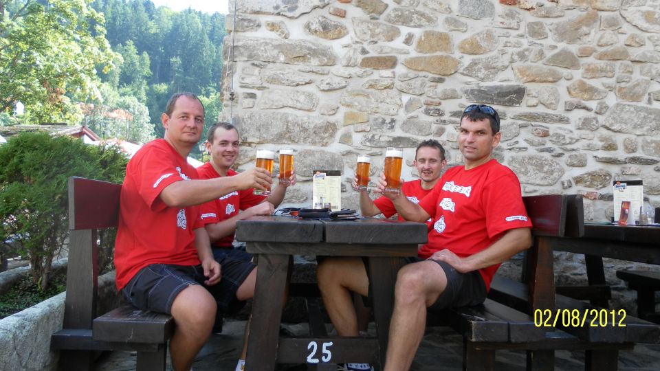 Český Krumlov je nádherný. Nechali jsme se přesvědčit dnešním volem Tomášem, že to tady zná a přejíždíme na pravý břeh. K zámku nám to sice trvá asi o 15 minut déle než, kdybychom vodu nepřejížděli, ale ty výhledy stojí za to. No a ještě jsme si pokecali s bikery z Holandska. Paní měla nezapomenutelný ozubený grafitový řemen. No co by to bylo za obhlídku Krumlova bez jednoho pivka a guláše v pivovarské hospodě.