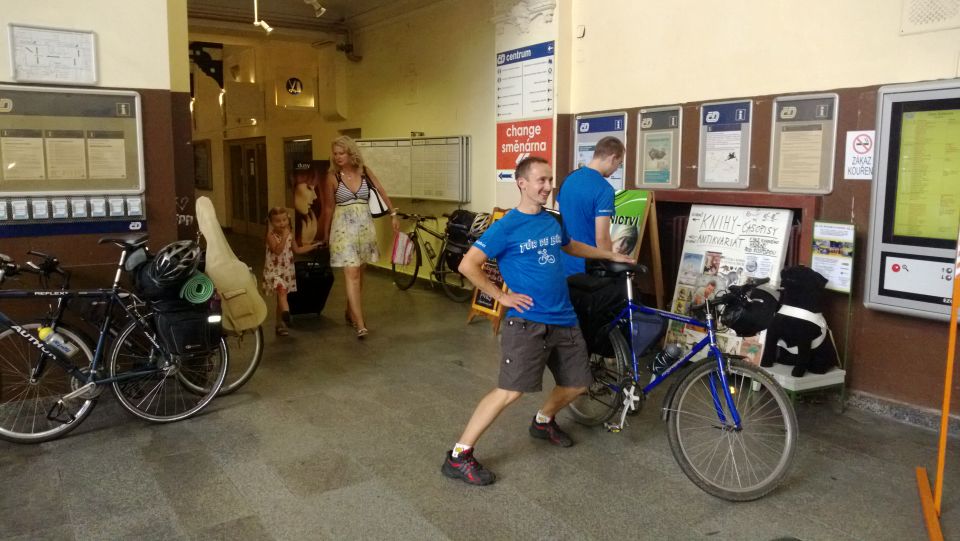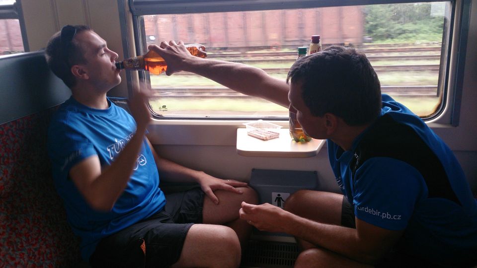 Dvanáctý ročník zahajujeme spořádaně. Lehce po osmé se setkáváme na nádraží v Příbrami. Vše probíhá hladce. Nakládáme kola, usedáme do kupé a začínáme vyndavat laskominy. 3 PETky, 4 Géčka v plechu a 3 zelený není nejsou na rozjezd k zahození. Jsme přece na Tur de Bír ne ? :-). Začínáme ochutnávat jednotlivé druhy a začíná se nám to líbit. Když se ještě převlékneme do nových funkčních, stálobarevných, pachuodolných a samočistících dresů a lístky nám k tomu štípe sympatická a usměvavá průvodčí, vypadá to na pěkný ročník. S blížícími se Budějovicemi mocně finišujeme a za stále častějšího navštěvování toalety obracíme lahve dnem vzhůru. Ještě, že je to rychlík s jen pár zastávkami :-). V takovém stavu jsme snad kromě znojemského ročníku nestartovali.