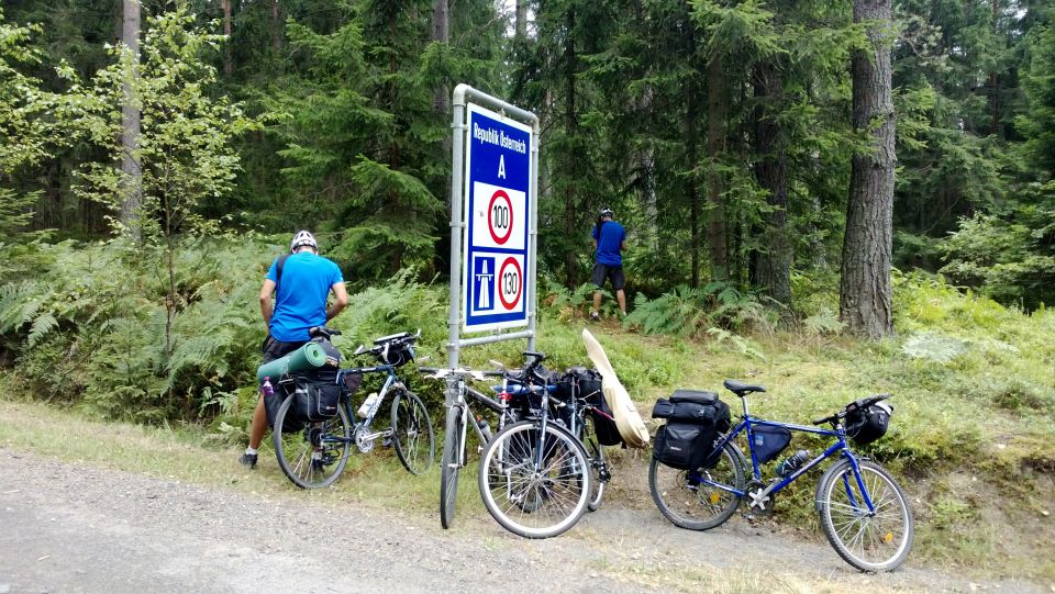 Vracíme se zpět do ČR. Blíží se večer. Na kraji Nové Bystřice, nedaleko místní služebny Policie vybíráme místo k přespání. A hajdy na večeři do místní zahradní restaurace. Naplníme žaludky, Milan bere kytaru a začínáme hrát a zpívat. Zpěvem se k nám přidávají i okolní stoly a pak to začíná. Přistává nám u stolu 4x vodečka, ajaj. Ztrácíme ostražitost, začínáme objednávat zelenou sami a světe div se Petr začíná zpívat.