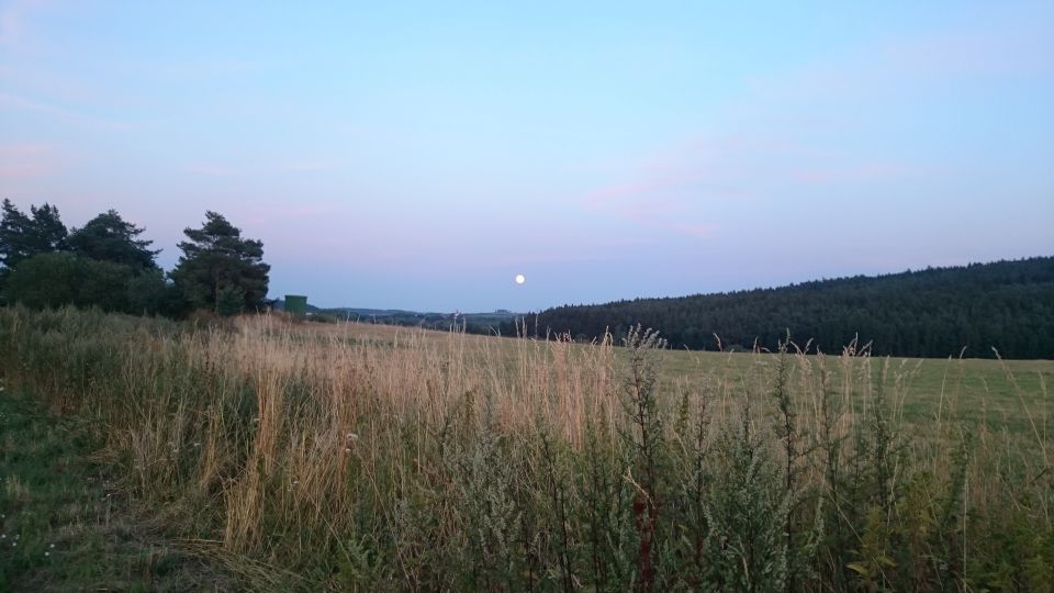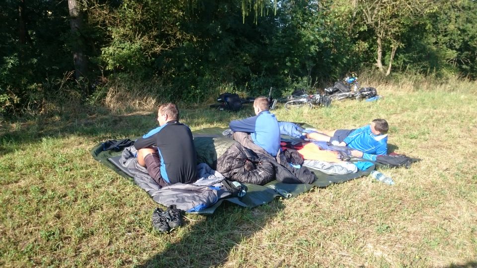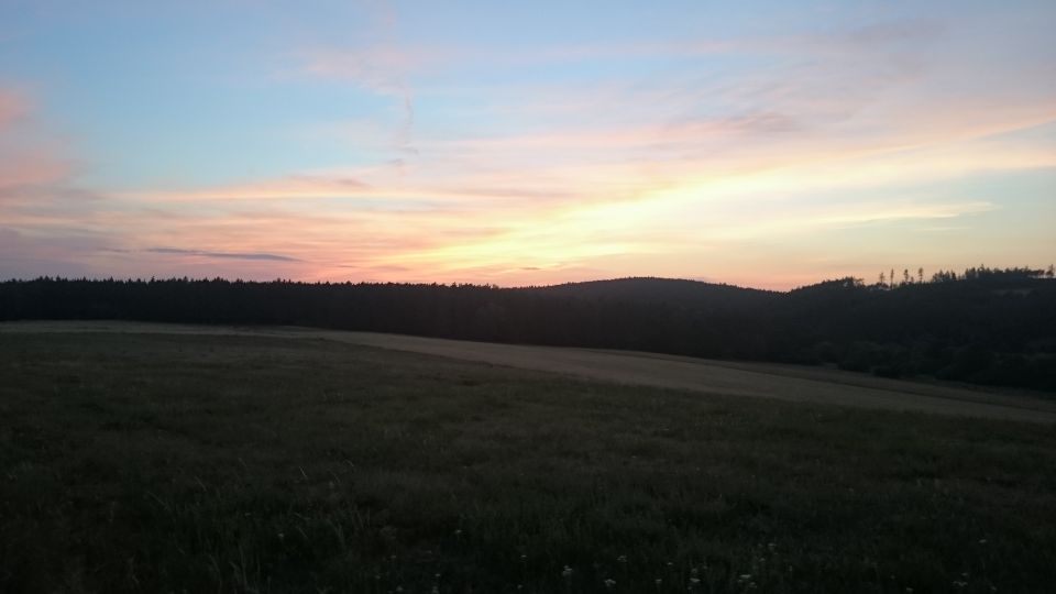 Tomáš má romantickou chvilku, fotí si západ slunce na každém kopci a zdržuje ostatní. Po pár kopcích nás čeká sjezd do tábora v Lučkovicích. Již zdálky slyšíme hudbu a hlahol, až z toho máme trošku obavy. Tady budeme dneska spát? Přijíždíme blíž, místní děti mají zrovna táborovou rozlučku. Hledáme, hledáme, ale teta nikde. Po čtvrthodině to vzdáváme a odjíždíme. Už je pořádná tma a my nemáme ani hospodu ani místo na spaní. Vyjíždíme téměř beze slova a pro změnu opět do kopce.