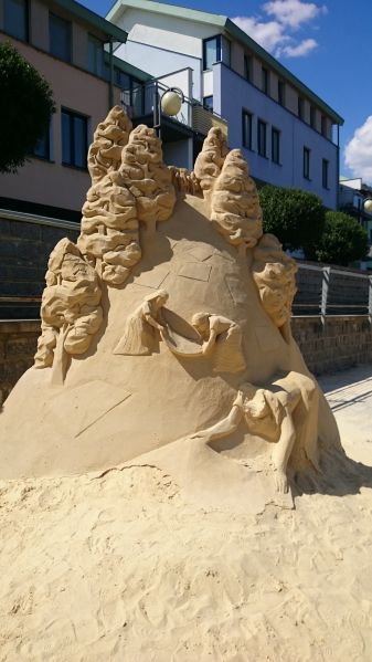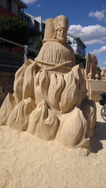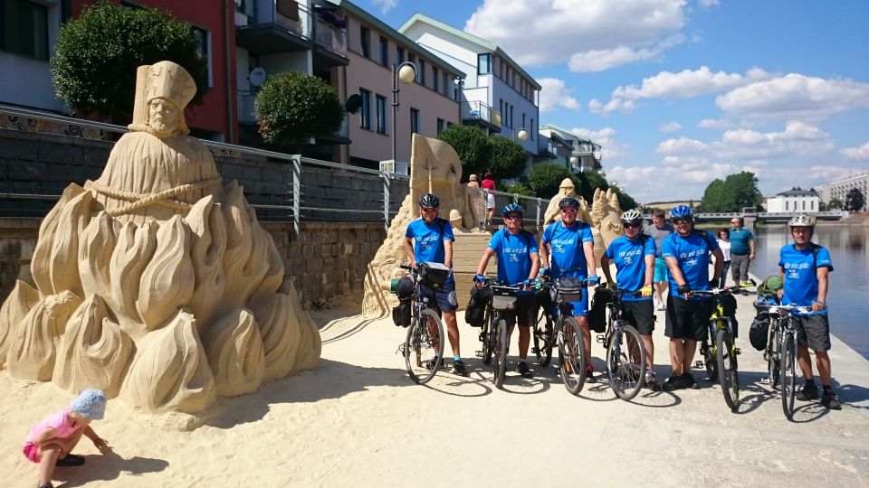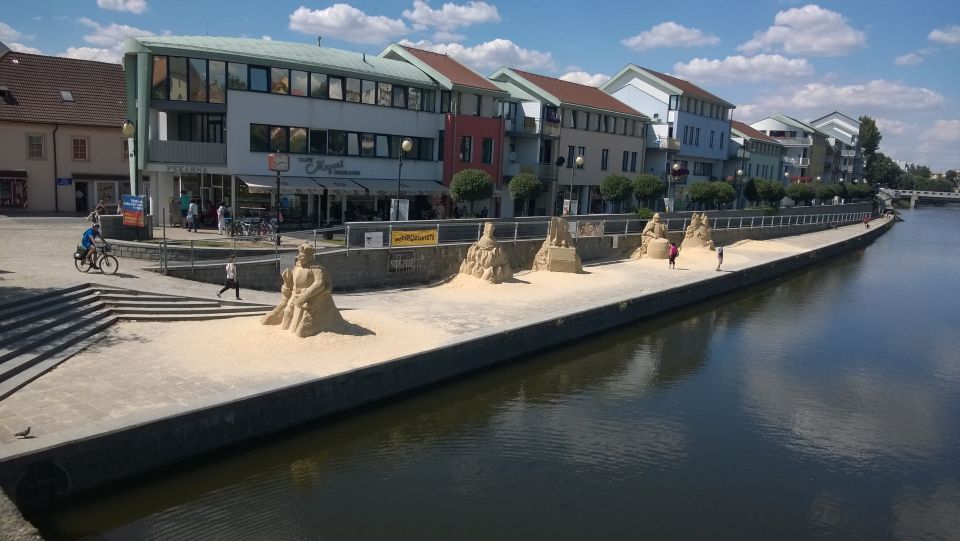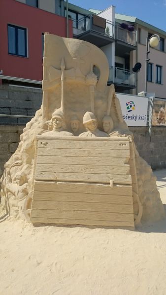 Konečně vyrážíme směr Písek. Tady si zajedeme na oběd. Nejdříve hledáme nějakou novou hospůdku, ale pak se necháme přemluvit místními na naší starou známou restauraci U Reinerů. Plznička je výborná a jídlo mají také dobré. Po řádném odpočinku a pár poobědových kouscích jedeme na místní náplavku. Chvíli obdivujeme místní sochy z písku, ale žízeň je neúprosná. Proto pokračujeme směrem na Zvíkovské Podhradí do místního pivovaru ;-). Světlé ležáky Zlatá labuť 11-13° nejsou vůbec špatné. Jen těch vos je letos nějak moc. Tomáš měl po návratu ze záchodu v půllitru dokonce tři. Jak se později ukázalo dvě z nich se tam nedostaly až zase tak úplně náhodou …