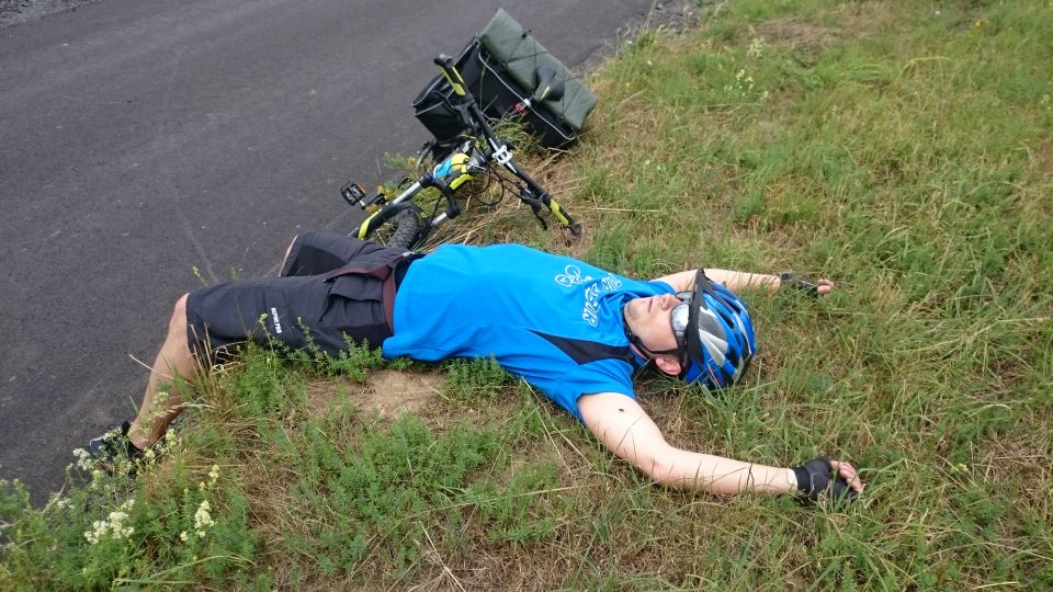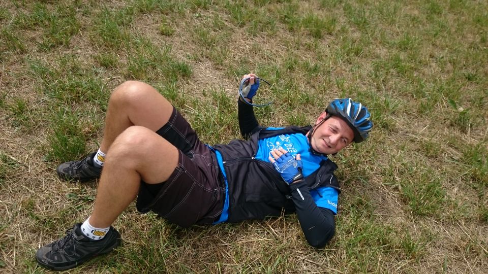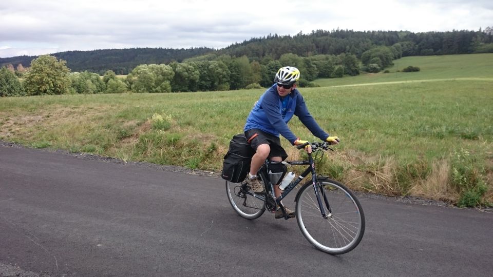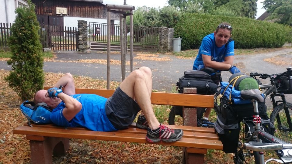 Přisedl si a poutavě vyprávěl zážitky z mládí a vysvětloval výhody výuky cizích jazyků přes postel. Nerozhodí ho ani chytré poznámky Petřáka unaveného po přepáleném startu. Škoda, že je moc brzy na to, tady zakotvit do večera a přespat tady. Tady by to šlo. Nic naplat, neradi, ale přece se loučíme a jedeme směrem na Sušici, cestou necestou. Nevyhýbáme se ani turistickým trasám lesem či po louce. Na galusky to tady sice není, ale nikdo z nás je stejně nemá a tlačí se tu docela dobře. Úsek mezi Velharticemi a Sušicí se snad zdál Petřákovi a Petrovi M trochu nudný, tak si ho oba nezávisle na sobě vylepšili letem. Zkrátka oba se vymleli. Díky jejich železné fyzičce a jasné mysli se jím naštěstí nic nestalo, tak to nebudeme rozmazávat. V Sušici jsme se napíchli na moc příjemnou stezku podél Otavy. Jedeme sice proti proudu, ale jede to skoro samo… až do odbočky na Kašperské Hory. Tady začínají ty pravé kopečky. Jsou tak krásné, že je škoda je rychle vyjet a vůbec si je nevychutnat. Takže chvost pelotonu má před sebou třičtvrtěhodinovou procházku s krásnými výhledy nejen na hrad Kašperk, zatímco předek pelotonu šlape rychle, snad ze strachu, aby v Kašperkách našli dobré místo na spaní. V Kašperských Horách se naše skupinka dává zase dohromady. Z výrazu v našich tvářích jde jasně číst, že touto horskou etapou pro dnešek končíme, máme hlad a žízeň, místo na spaní je vybrané, takže hurá do hospody. Toto klidné maloměsto ale není nakloněno nočnímu hulákání s kytarou, dnes je to tedy bez kytary. Alespoň jdeme spát v rozumný čas na louku na kraji města. Všichni uleháme jeden vedle druhého na plachtu ve spacáku pod širákem, jen Petřák si veze vlastní přístřešek a trochu se tak separuje. No jo, nováček smiley.