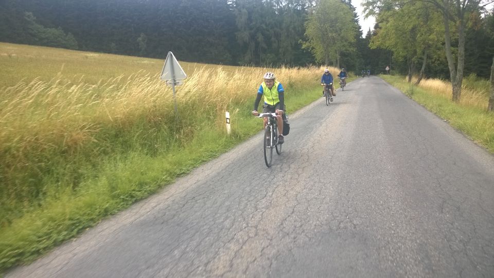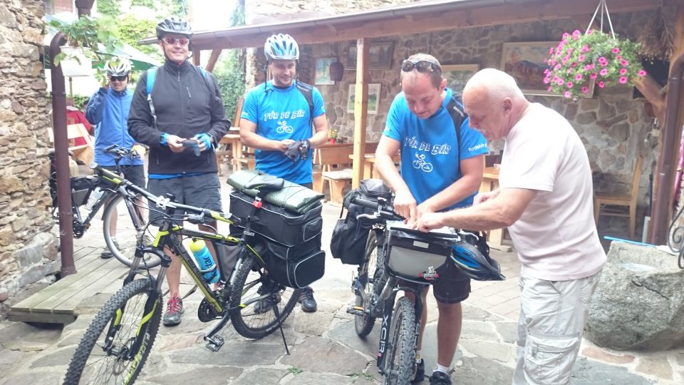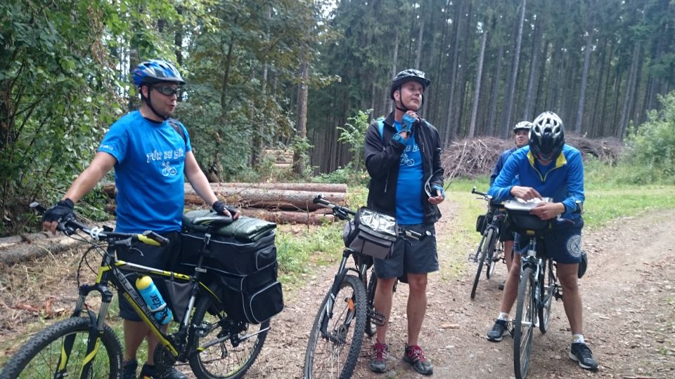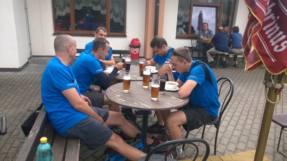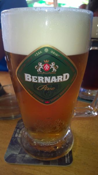 Nedlouho po rozjezdu v pelotonu se ukazuje, kdo to tady asi zná a nemá tedy potřebu se zdržovat kocháním se krásou místní přírody a naopak kdo si místní krajinu rád vychutnává i jinými smysly, než je bolest stehenních svalů. Na chvostu pelotonu se tedy usazují požitkáři Petr M. s Milanem. Tahle umístění v pelotu si už nenechají během letošní TdB nikým vzít. Cyklostezka nás právě v čase oběda přivedla k Eurokempu v Běšinách. Obědváme, ale za delší zdržení to tu nestojí. Přes Nemiklov přijíždíme do Velhartic, kde nás žízeň vžene do Hospůdky Na Kovárně. To byla dobrá volba. Točí tady výborného Bernarda a pan Matušek, majitel podniku maje vkus a čich na dobré lidi, si nás okamžitě oblíbil.