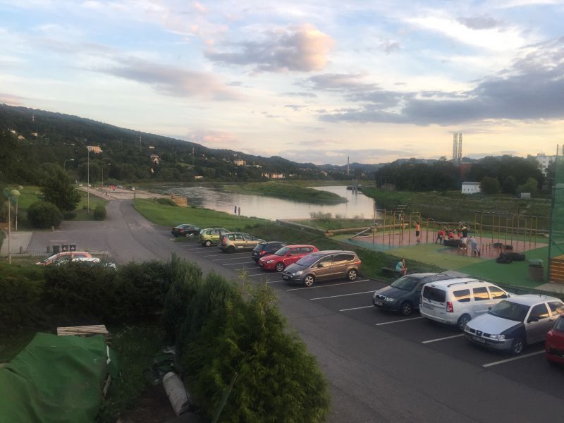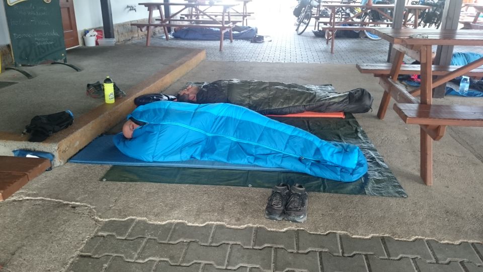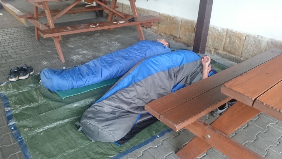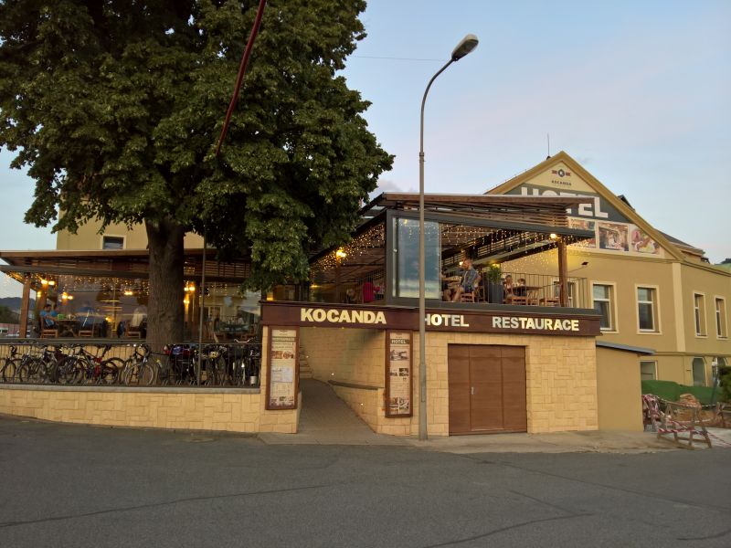 V Děčíně rychle najdeme kemp, o kterém jsme si dopředu zjistili, že je jediný široko daleko. Kemp je na opravdu hnusnym místě, u řeky pod dálničním mostem. Do klidného, idylického nebo dokonce romantického místa to má nekonečně daleko. Na takovém místě bychom nikdy nespali, kdyby byla možnost někde jinde. Ale ve zdejším kopcovitém terénu bychom místo na spaní hledali jen těžko, takže neradi, ale přece zůstáváme v kempu. Správci kempu nás důrazně upozorňují, že se tam dost krade, ať si raději dáme kola do uzamykatelných boxů, které tam k tomu účelu mají. Opravdu nevím, co může někoho vést k tomu, aby v tomto kempu strávil víc než jednu noc. Jdeme raději povečeřet a uhasit žízeň mimo kemp do nedaleké hospody Kocanda. Jídlo i pití dobré, ale obsluha je dost kyselá a dojem z hospody výraně sráží. Dneska na kytaru nedojde a s flámováním to nepřeháníme. Vracíme se kempu, kola pořádně zamkneme z části do boxů, z části vedle celty, na které spíme a bez dalších odkladů usínáme. Toto je naše první noc letošní TDB, na kterou nehlásí déšť, takže můžeme spát prvně pod širákem.