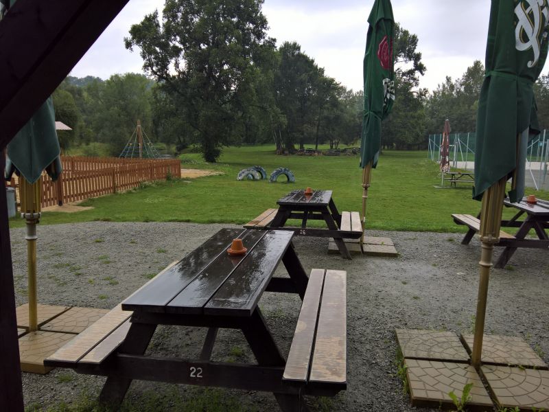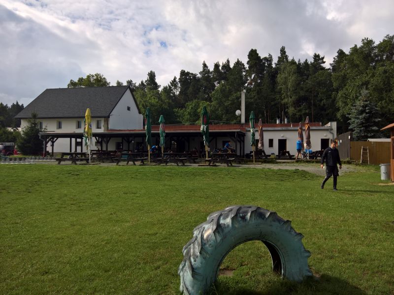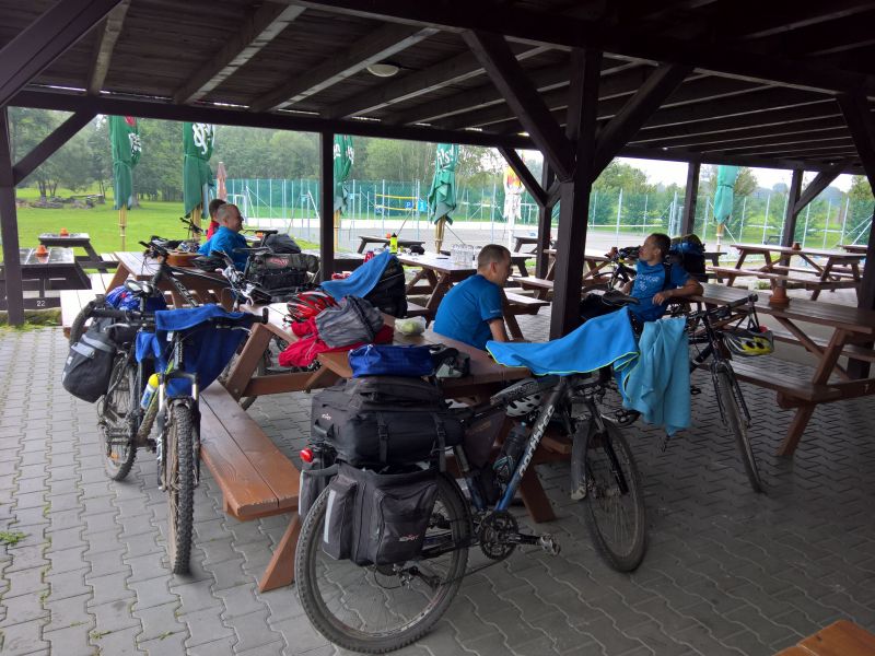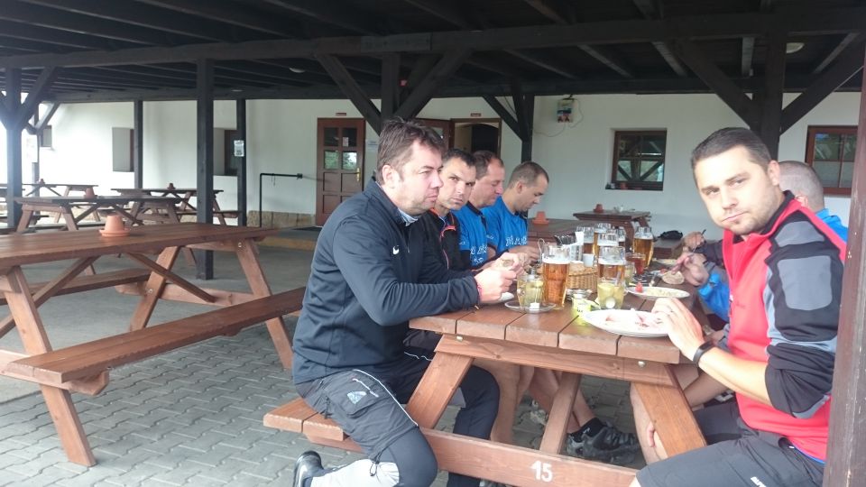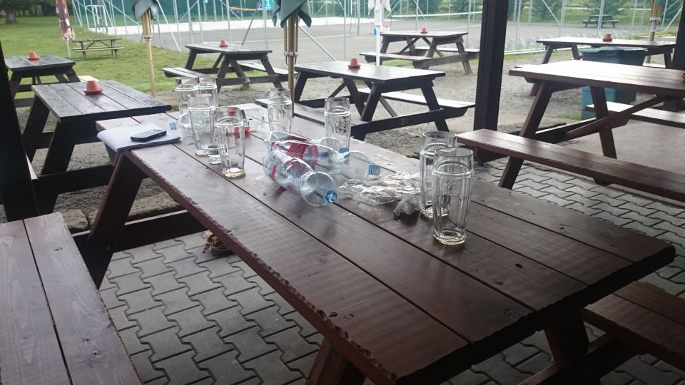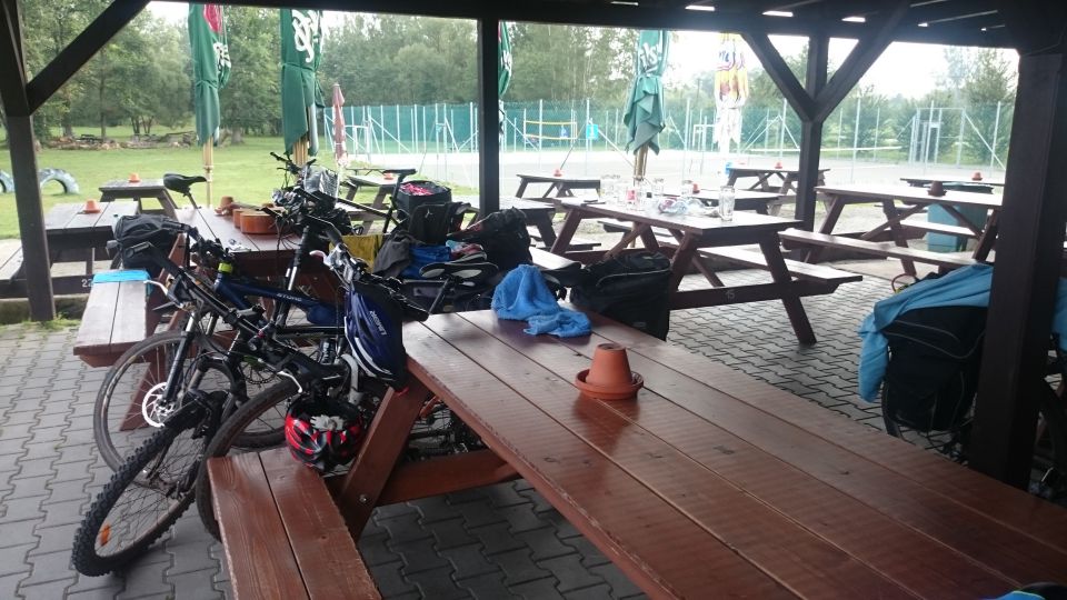 Není kam chvátat, stejně začalo pršet. Restaurace sice otevírá oficiálně až v 10 hodin, ale příjemný personál doráží docela brzy ráno a dělají nám luxusní snídani dlouho před otvíračkou. Ke snídani nám příroda připravuje neobvyklou podívanou. Přesně v polovině terasy je totiž jasně viditelná hranice deštivého počasí. Vedle poloviny terasy docela pěkně prší a na druhém konci terasy ani kapka. Když se vypršelo, jdeme do sedel, směr Česká Lípa. Centrum nás neláká, tak míříme rovnou na Cyklostezku Varhany. Na kraji České Lípy se nám ale postaví do cesty hospoda Střelnice s nabídkou nám neznámého piva Cvikov. To je výzva, které nelze odolat. Cvikov u nás ovšem nezabodoval. Bylo to bezkonkurenčně nejhorší pivo letošního ročníku. Dokonce jsme se báli následků, ale naše žaludky to nakonec zvládly.