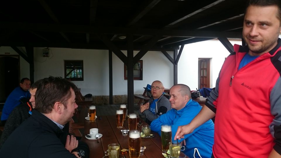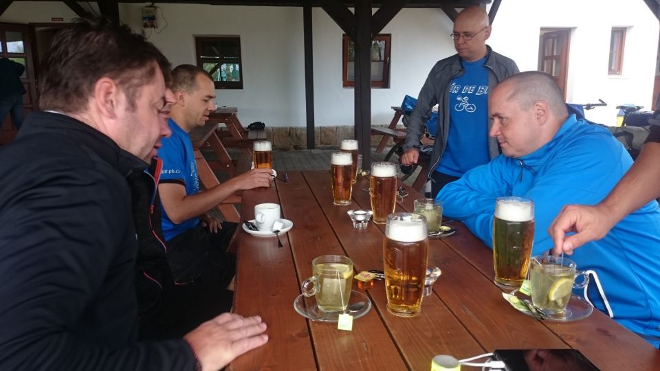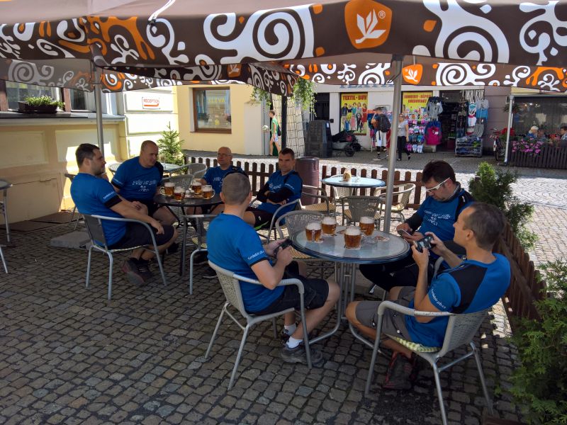 Už máme hlad, ale ukazuje se, že tady hospody, ve kterých se vaří, prostě nejsou. Musíme tedy dál a dál, hledáme a chytáme se s jídlem až v České Kamenici, kde na náměstí obědváme. Je pátek a tedy den před odjezdem domů, takže je potřeba zajistit místenky ve vlaku, který nás vezme i s kolama. Toť jasný úkol pro vola dne. Na místním nádraží ovšem neuspějeme, tady se lístky koupit nedají. Jsme opět odkázáni na internet a časově náročnou komunikaci se zákaznickým centrem ČD. K takovéto akci se báječně hodí zdejší pivovar. Exkursi sice nepodnikneme, ale degustaci všech domácích piv si ujít nenecháme. Jedno pivo lepší, než druhé, to nemohu říct. Ale na rozdíl od Cvikova by se pitelný vzorek vybrat dal. Zároveň s degustací probíhala objednávka jízdenek on-line u ČD, ovšem bez valného úspěchu, tak jako v některých předešlých ročnících TDB. Vysvětlení se nám dostalo na infolince ČD, takže si kluci už laskavě zapamatujte: on-line předprodej místenek a rezervací pro kola začíná 60 dní před datem odjezdu a od šesti cestujících výše doporučují ČD objednávku přepravy skupiny, nejpozději však 72hod. před odjezdem. Jinak řečeno, místa na kola jsou vyprodána a nemáme jistotu, že se zítra všichni vejdeme do jednoho vlaku i s kolama. Nezbývá, než být v Děčíně, nebo v Ústí nad Labem u vlaku včas a místa si zajistit ostrými lokty.