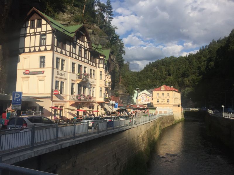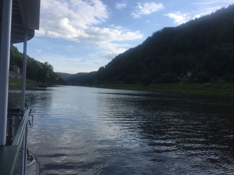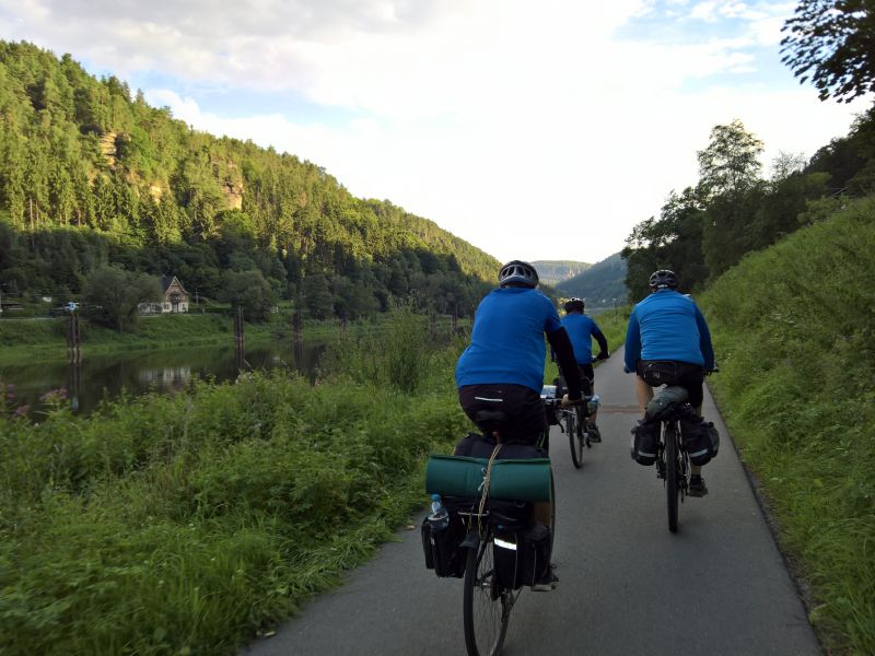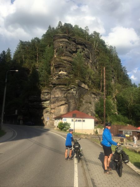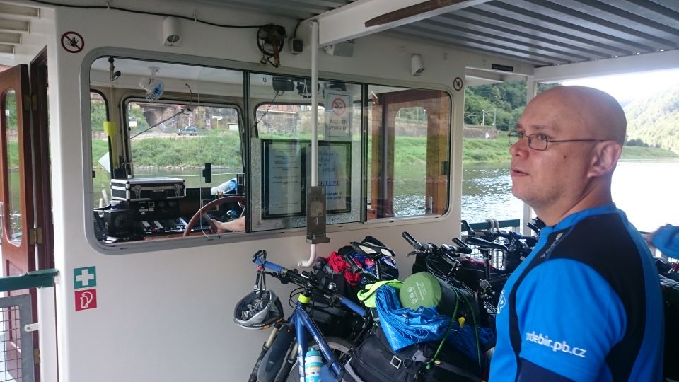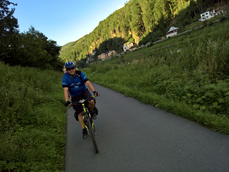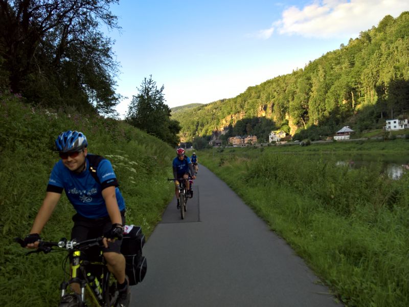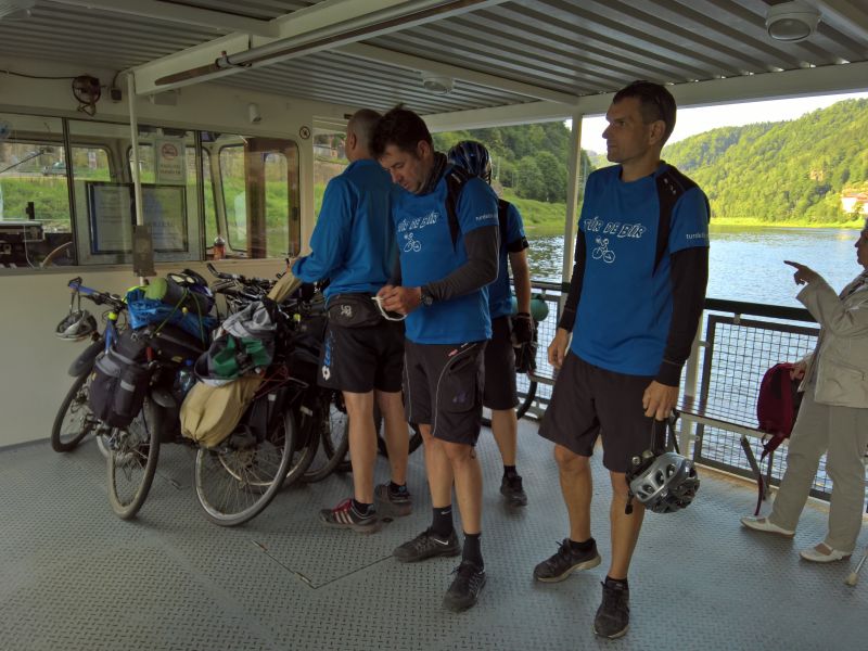Jedeme dál směrem na Hřensko. Začíná stoupání, láme se to až v Janově, kde s chutí polkneme jednoho rakovnického Bakaláře. Teď už nás čeká mnohem příjemnější klesání do Hřenska. Úzkou, klikatou silnici lemují příkré srázy. Tady bychom místo na spaní našli jen těžko. Ještě že nás brzdila auta, protože v jedné zatáčce se na úzké silnici nedokázal vytočit autobus a protijedoucí auto a udělali tam pěkný špunt. Na kolech snadno prokličkujeme, ale kdybychom měli rozjetá kola tak, jak to kopec umožňoval, jen těžko bychom dobrzdili včas. Hřenskem projíždíme podél Kamenice k Labi. Podél Labe vede pěkná cyklostezka, ovšem po druhém břehu. Využijeme tedy kamenický přívoz a necháme se převézt na druhý břeh, čímž jsme překročili státní hranici do Německa. Proti proudu Labe nám to jede parádně až do Děčína. Po pár kilometrech stezka opět protnula státní hranici, jsme zase doma.