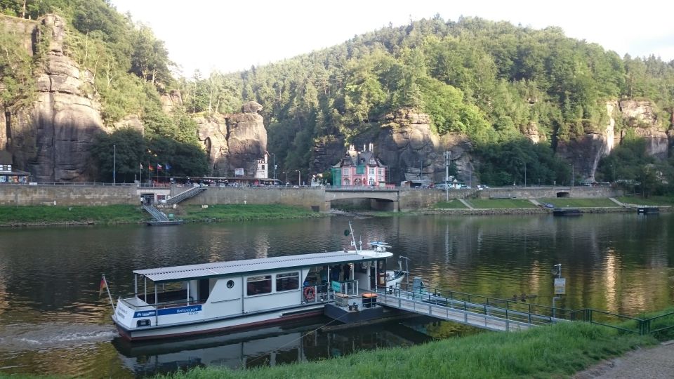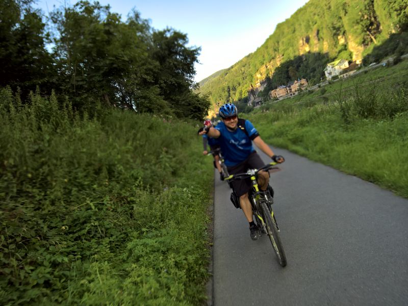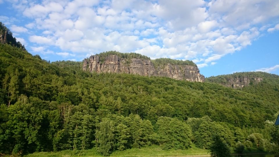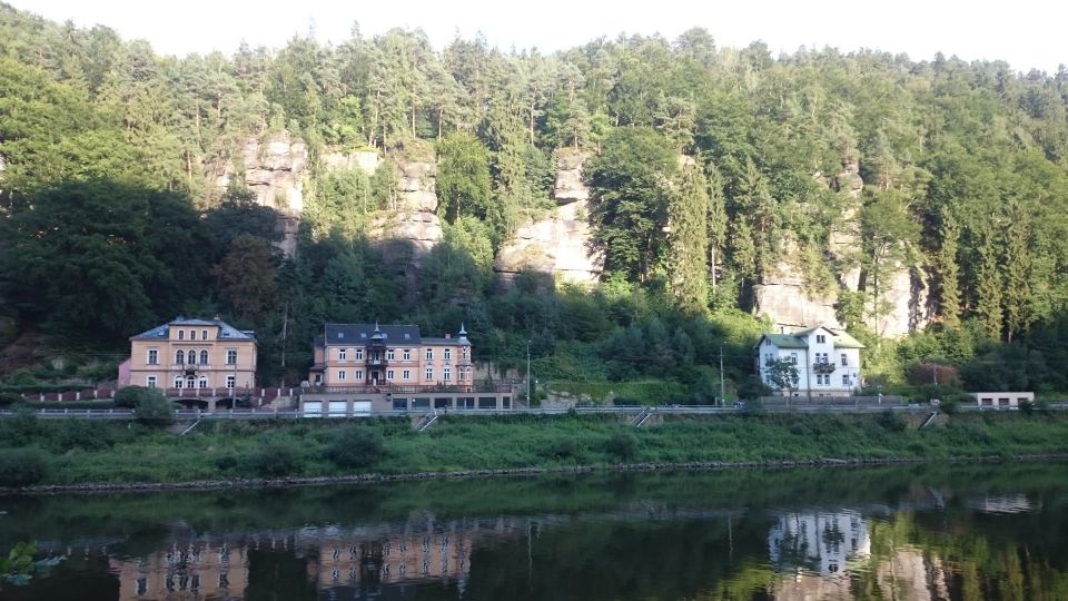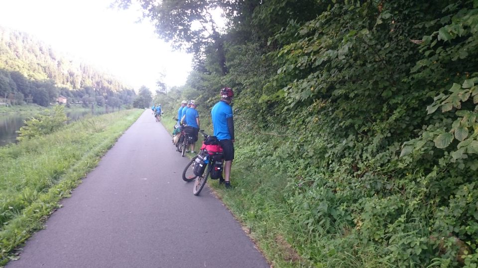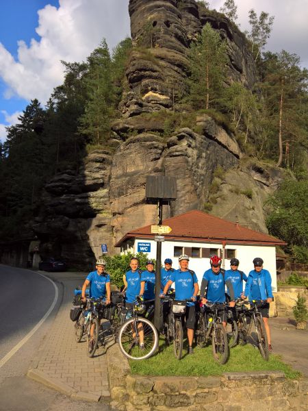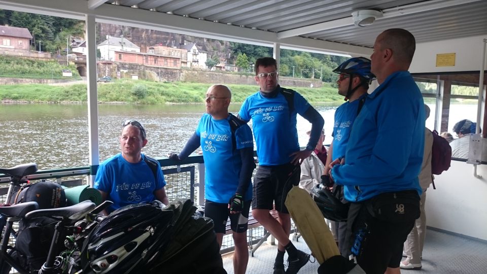 Jedeme dál směrem na Hřensko. Začíná stoupání, láme se to až v Janově, kde s chutí polkneme jednoho rakovnického Bakaláře. Teď už nás čeká mnohem příjemnější klesání do Hřenska. Úzkou, klikatou silnici lemují příkré srázy. Tady bychom místo na spaní našli jen těžko. Ještě že nás brzdila auta, protože v jedné zatáčce se na úzké silnici nedokázal vytočit autobus a protijedoucí auto a udělali tam pěkný špunt. Na kolech snadno prokličkujeme, ale kdybychom měli rozjetá kola tak, jak to kopec umožňoval, jen těžko bychom dobrzdili včas. Hřenskem projíždíme podél Kamenice k Labi. Podél Labe vede pěkná cyklostezka, ovšem po druhém břehu. Využijeme tedy kamenický přívoz a necháme se převézt na druhý břeh, čímž jsme překročili státní hranici do Německa. Proti proudu Labe nám to jede parádně až do Děčína. Po pár kilometrech stezka opět protnula státní hranici, jsme zase doma.