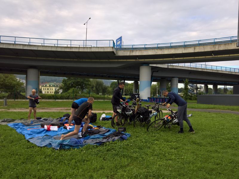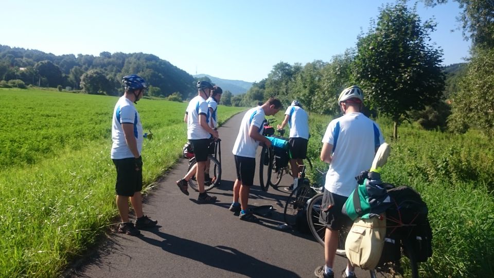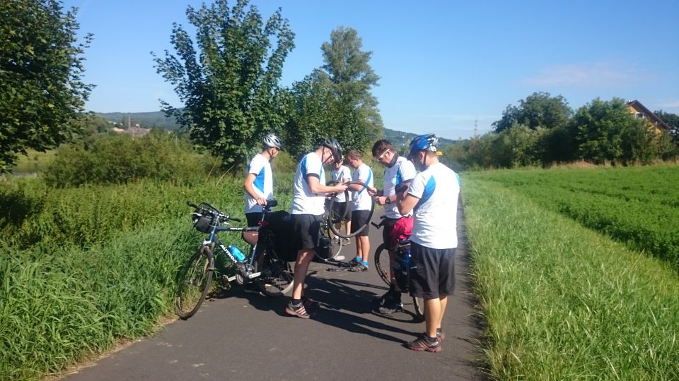 Vyrážíme z parku a nálada je úplně jiná. Najednou mají všichni chuť si povídat a dělat kraviny. Z Boletic vyrážíme směr Ústí a najíždíme na luxusní cyklostezku. Po deseti minutách příjemné jízdy se ozve menší rána a jéje, Petr H. má duši na měkko. A jéje, zalepeno, ale plášť má díru velikosti mexického dolaru. Naštěstí vozíme s sebou profi cyklo nářadí a plášť je několikrát obmotán průhlednou páskou. Padá i několik návrhů na změnu vola dne, ale neuspěji. Petr má opraveno, ale situace se mění. Panuje obava zda plášť vůbec vydrží a Petr se zdárně dostane do cíle. Dohodneme se, že se pokusíme co nejrychleji dostat do Ústí nad Labem. Tůr de Bír se mění pouze na Tůr (my ten den neměli ani jedno pivo). Pokračujeme po cyklostezce, hlídáme Petrův plášť, ale začínáme i pátrat po prvním pivku. Plášť drží, pouze ještě jednou Petr obmotává páskou. Jedeme dál po cyklostezce, ale žádná restaurace, stánek ani hospůdka není otevřená. Dostáváme se i do Velkého Března a věříme v místní Pivovar Březňák. Ouha, zavřeno i v pivovaru. Začínají se u nás projevovat abstinenční příznaky z nedostatku piva. Jsme kousek od Ústí nad Labem a jsme rozhodnuti dojet na nádraží, pořešit vlak a pak se někde osvěžit.