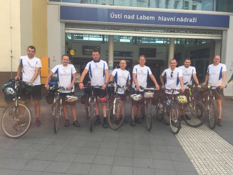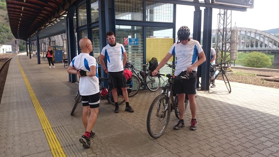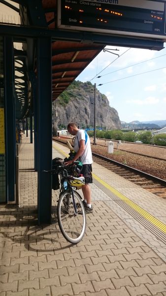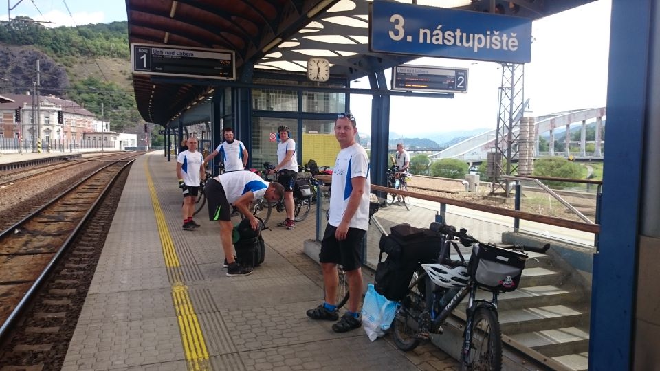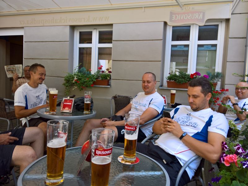 Dostáváme se bez problémů do Ústí a nacházíme nádraží. Vůl zařizuje lístky pro kola i pasažéry a my se rozdělujeme na dvě skupiny.Turisty – jdou se podívat trochu po Ústí na památky a pivaře – jdou ihned do krušovické restaurace u nádraží. Zde s námi sedí neskutečná postava. Je u svého stolku sám a pokouší se navázat komunikaci se všemi ostatními hosty. Moc se mu to nedaří, protože používá svojí řeč, které nikdo nerozumí, ale která ho pokaždé strašně rozesměje. Podle tónu hlasu chvilku nadává, chvilku je smutný, ale vždy hovor ukončí svým hehehehehehe. Nikdo se s ním nebaví. Přichází i druhá půlka výpravy – turisti a dávají si také pivo a ihned zaregistrují místního opilce. Petřák poznamenává, že to je ideální předloha feldkuráta Katze ze Švejka, když byl přivezen opilý drožkou domů a snaží se komunikovat se svým sluhou. Dopíjíme a vyrážíme na vlak.Petřák s Tomášem jdou zakoupit jízdenky, Petr H. a Pavel nakupují ještě nějaké pivko do vlaku. Přicházíme na nástupiště, sundaváme tašky z kol a připravujeme se na příjezd vlaku.