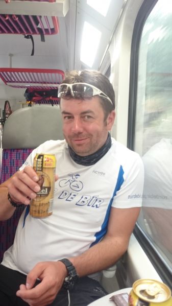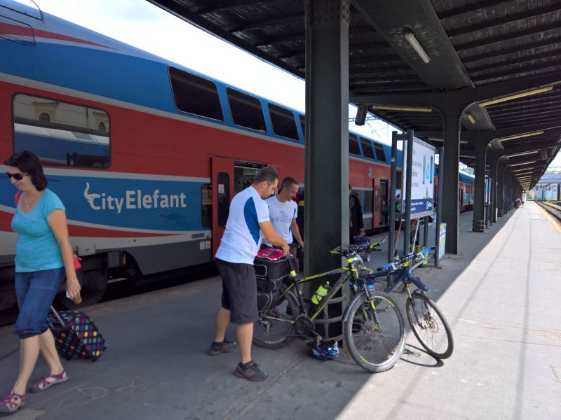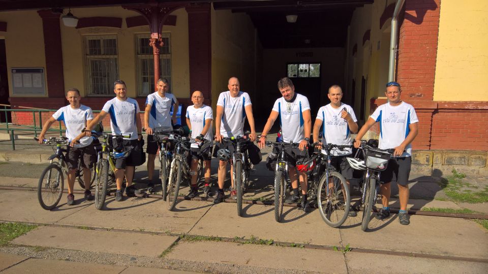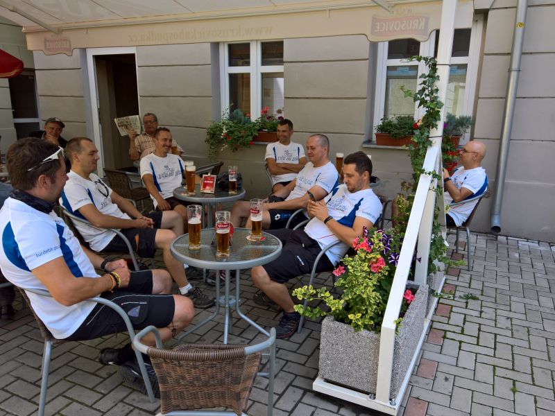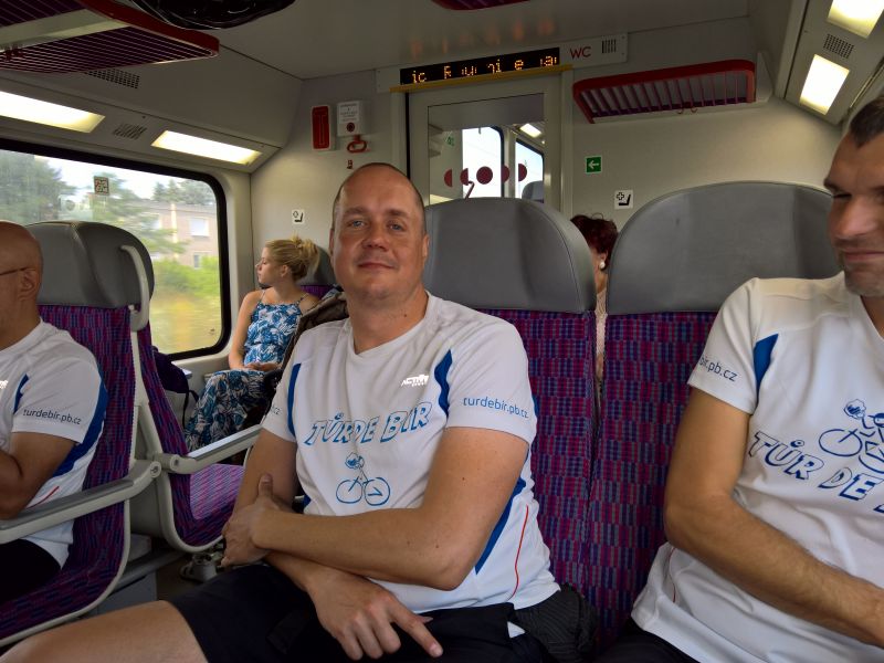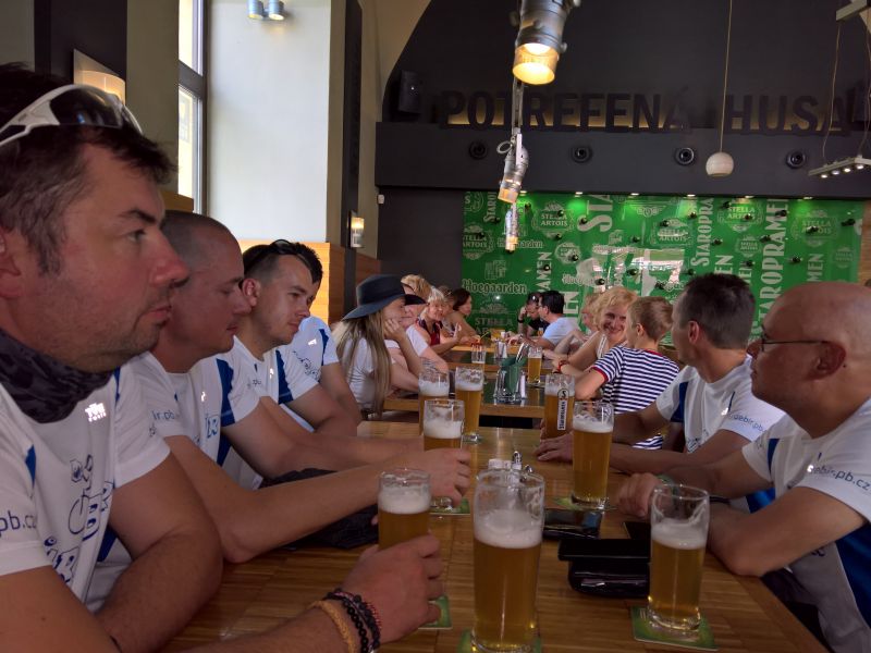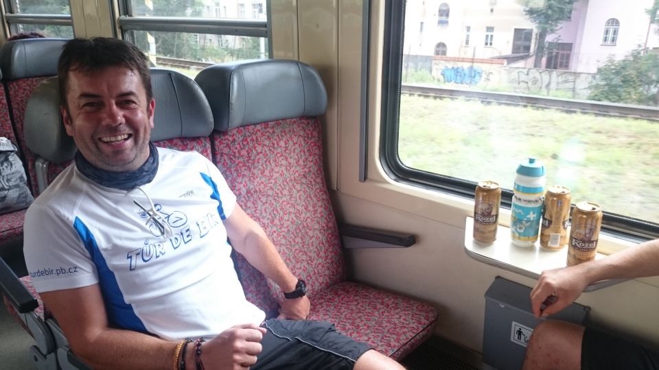 Jsme na Masarykově Nádraží v Praze a máme asi hodinu času na odjezd do Příbrami. Dohodneme se na pivku v Potrefené Huse. Přijíždíme k Huse, přivazujeme kola naproti restauraci a jdeme si sednout na pivko a na výbornou gulášovou polévku. Platíme a vyrážíme na Hlavní Nádraží zkusit první možnost odjezdu do Příbrami, která akorát stojí připravená k odjezdu. Máme smůlu. Tolik kol nevezmou a musíme počkat na další spoj, který jede skoro až za dvě hodiny. Vracet do Husy se nám nechce, tak vyzkoušíme Krušovickou Šalandu přímo na Hlavním Nádraží. Popíjíme a pravidelně se střídáme na WC, které je zpoplatněno. Některé držgrešle močí v parku na staveništi. Konečně se přiblížil čas odjezdu. Jsme na nástupišti. Ujímá se nás pohodový průvodčí, který nám otevírá i služební prostor vlaku a umožňuje nám zde převoz našich kol. Cesta probíhá v klidu a také to tak vypadá ve vlaku. Většina je různě zkroucena na sedadlech a v poklidu klimbá. Přijíždíme do Příbrami. Zde čeká Petra Hosírka servisní vůz s několika náhradními plášti a Martinou a rovnou na parkovišti si plášť mění. Martinu ne.