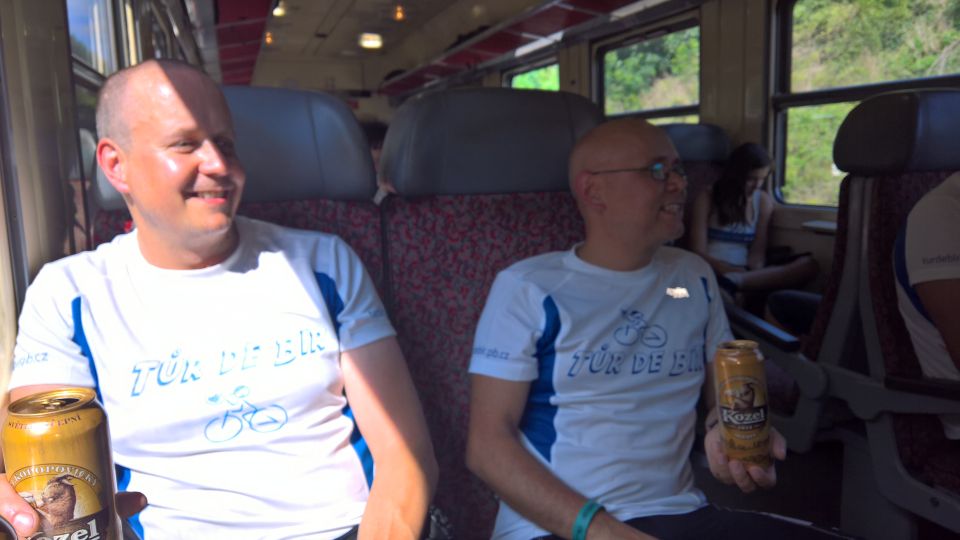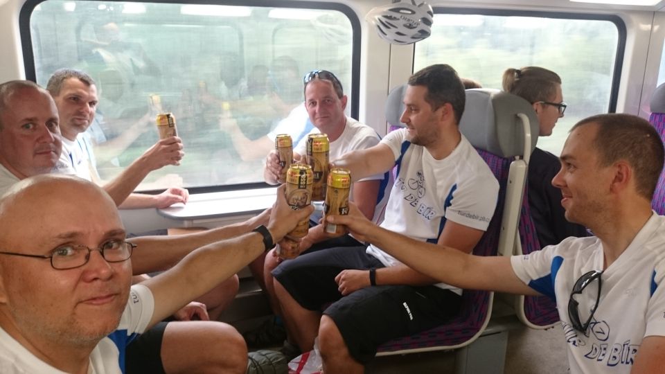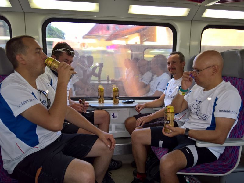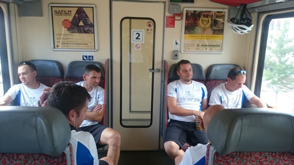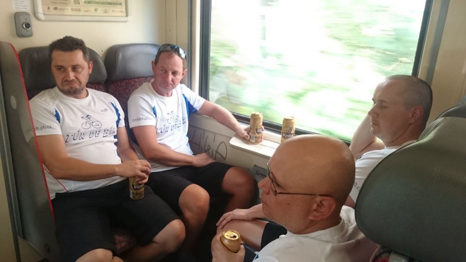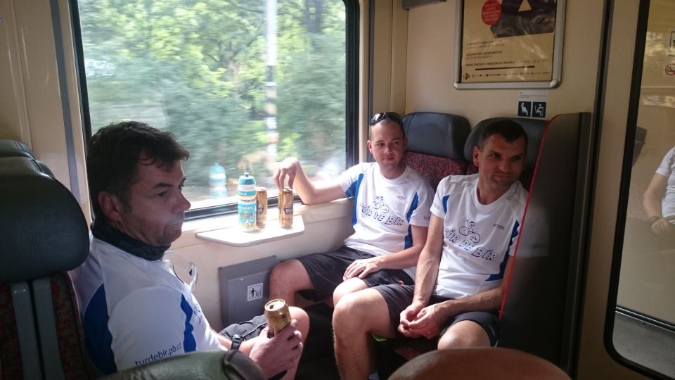 Vlak přijíždí a my se vydáváme vlakem pohodlně směr Praha i s igelitkou plnou chlazených piv, které slavnostně otevíráme a popíjíme po celou cestu do Prahy. Část výpravy, co sedí proti směru jízdy, má i krásný výhled na mladou maminku a co chvilku vypadávají z tématu hovoru pro nemožnost se soustředit i na druhou věc. Maminka nás na kraji Prahy opouští a my si opět všichni rozumíme.