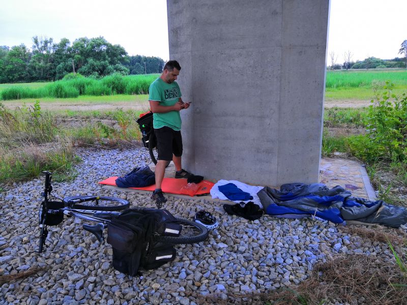 Bzz plesk, bzz plesk, bzzz zzz ..... Probouzím se a koukám na hodinky. Je třičtvrtě na pět. Zaposlouchávám se do okolních zvuků. Chrápání. Jasně klasika. Sem tam nějaké auto. To mě nepřekvapuje. Spíme kousek vedle E59 (Pozn. Evropská silnice E59 je evropskou silnicí 1. třídy ve směru sever-jih. Začíná v Praze, prochází Vídní, Mariborem a končí v Záhřebu. Celá trasa měří 644 kilometrů.). Komáři: no, kdo mohl vědět že kousek vedle místa, kde jsme ulehli je rybník Brčálník, jak z večečníčku o Rákosníčkovi. Ale jak jsem si toho mohl všimnout, když už byla skoro tma. Ale slyším ještě něco. Něco, co se mi vůbec nelíbí. Ten zvuk už jsem někde slyšel, jak se pomalu vynořuji ze spánku už mi začíná svítat. Přítel radar mi potvrzuje mé obavy, blíží se k nám bouřka. Začínám pomalu budit i ostatní.