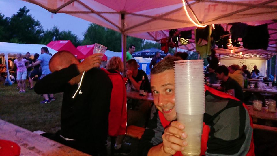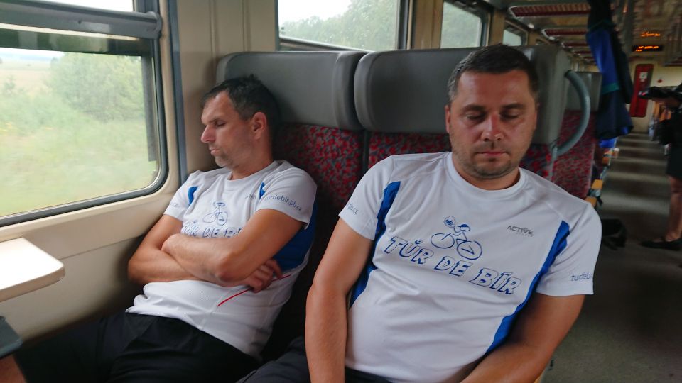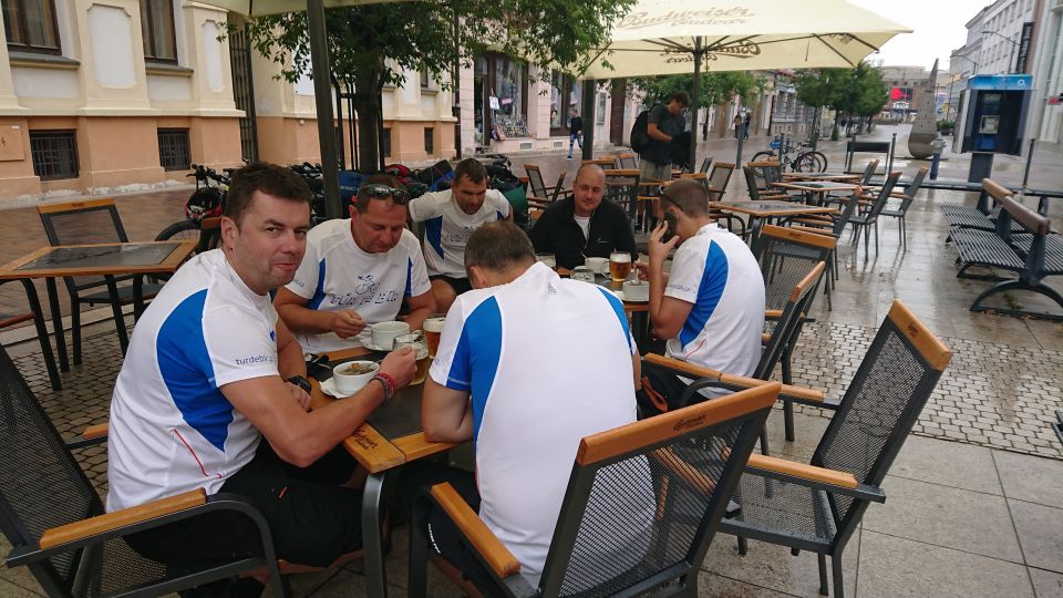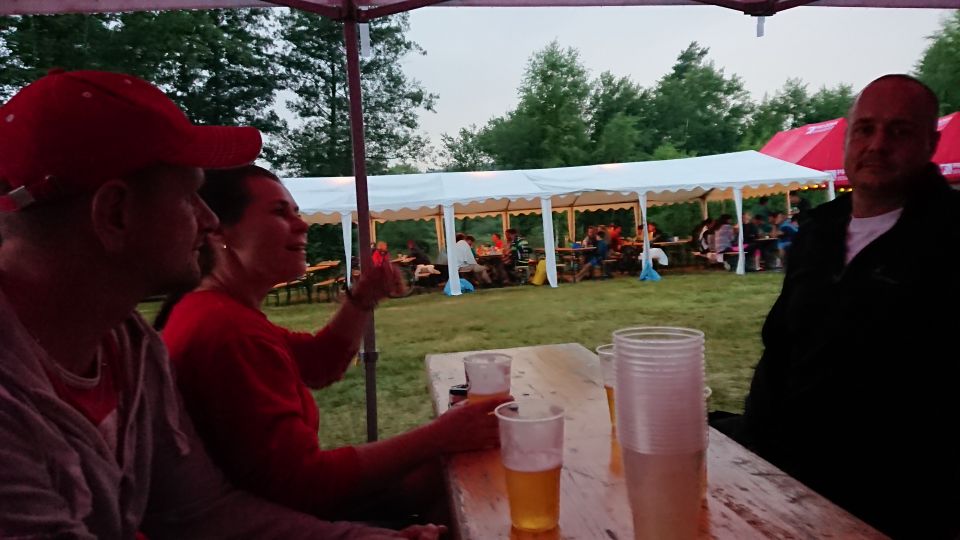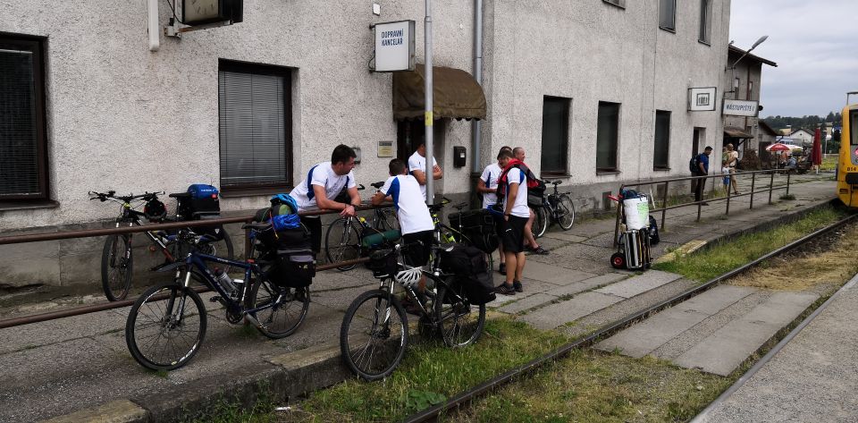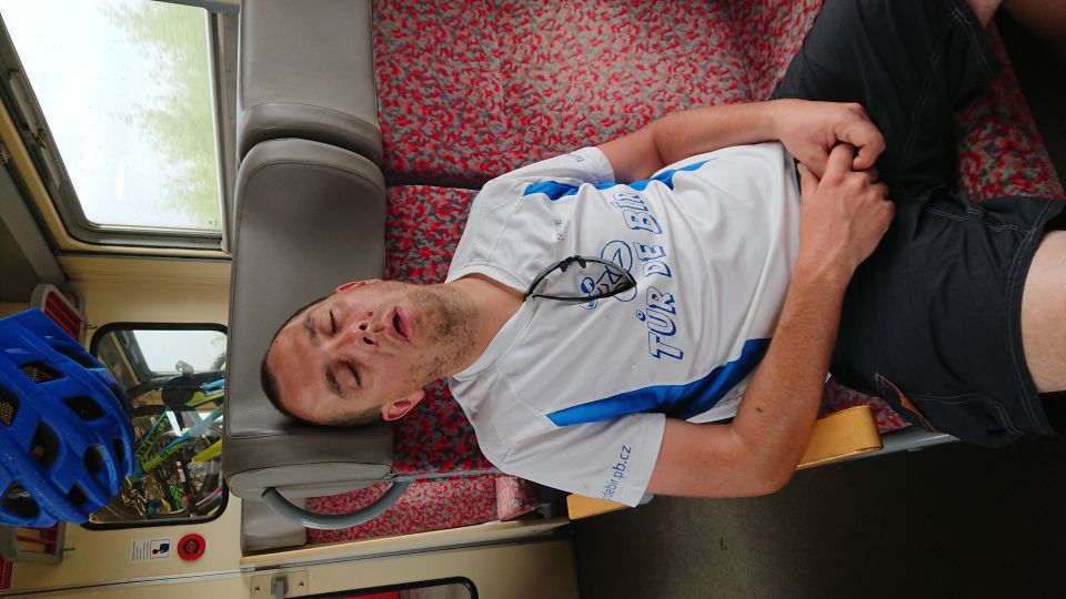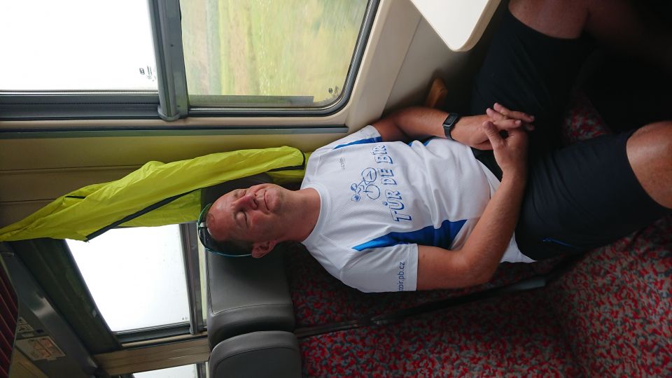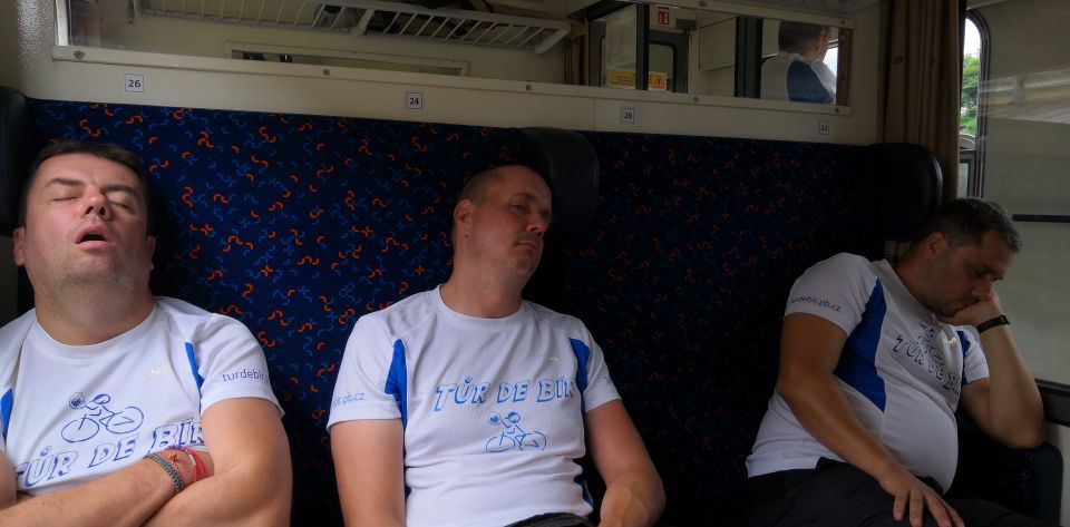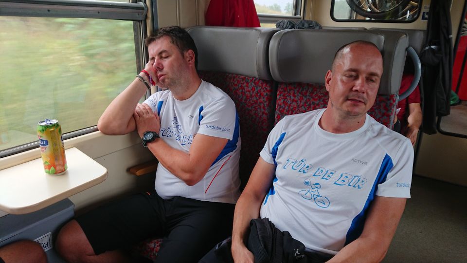 Jedeme na nádraží a snídáme. Po zkušenostech z minulých ročníků si sváteční bílá trička převlékáme až po snídani. Je stejně jen otázkou času, který čuňátko si ho jako první pokydá kečupem, hořčicí, nebo něčím ještě horším. Přestupujeme v Okříškách a pádíme dál směr České Budějovice. Máme asi hodinku čas, vyrážíme do centra na něco k snědku. Času moc nemáme. Parkujeme v Lannově třídě na předzahrádce restaurace Vatikán. Obsluha sympatičností příliš neoplývá. Tomáš musí použít svůj veškerý um, aby servírku, která si s ním mimochodem vůbec servítky nebrala, přesvědčil, že sice prší, ale my bychom rádi ten nečas přečkali na zahrádce pod slunečníkem. Povedlo se, dostáváme polévku a Budvar Kroužek (Ležák 5%, do kterého se před stočením přidávají živé kvasnice – tzv. kroužky. Pivo jim vděčí jak za svůj název, tak i svěží a čerstvou chuť.). Pelášíme zpátky na nádraží, abychom stihli vlak do Příbrami. Ve vlaku je skvělá nálada. Celou cestu si stále dokola vyprávíme zážitky z uplynulých čtyř dní. Takže ani oko nezamhouříme a jsme v Příbrami.
